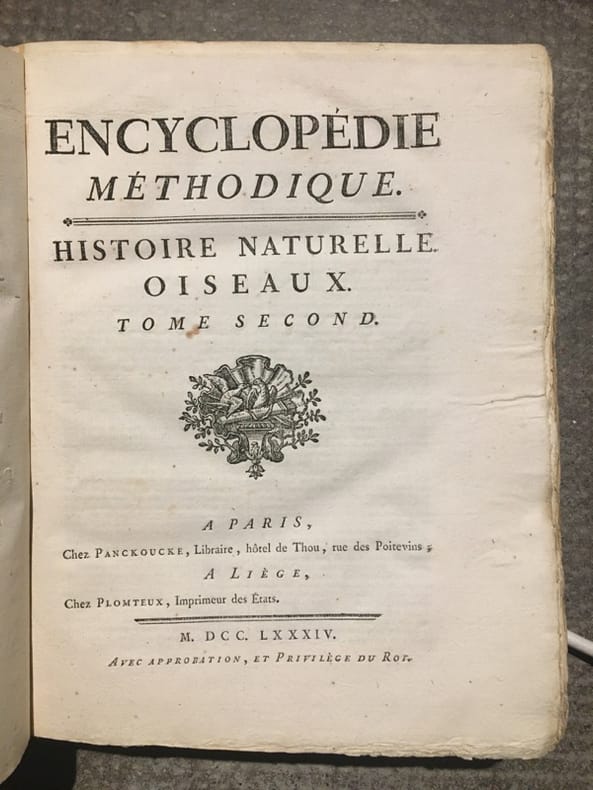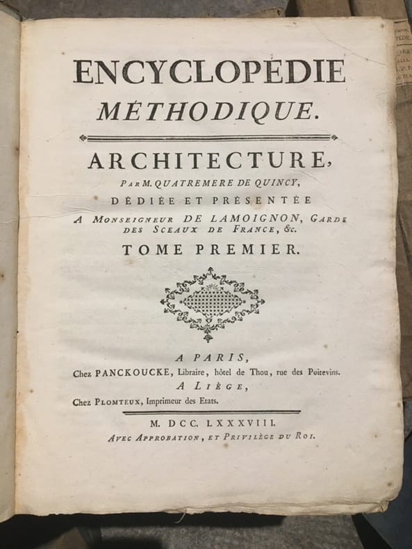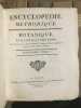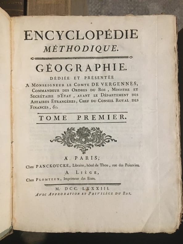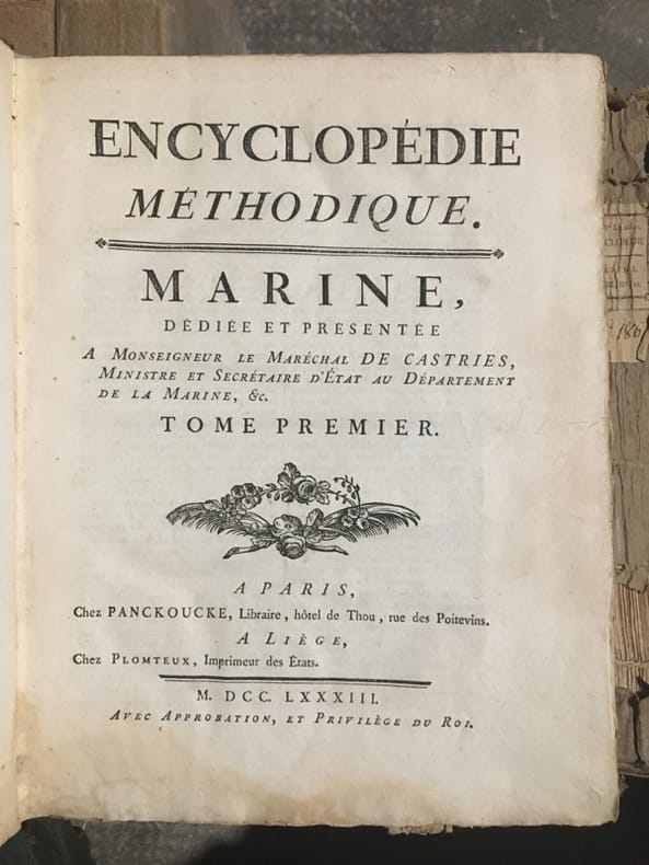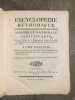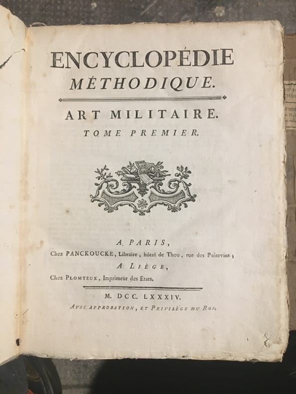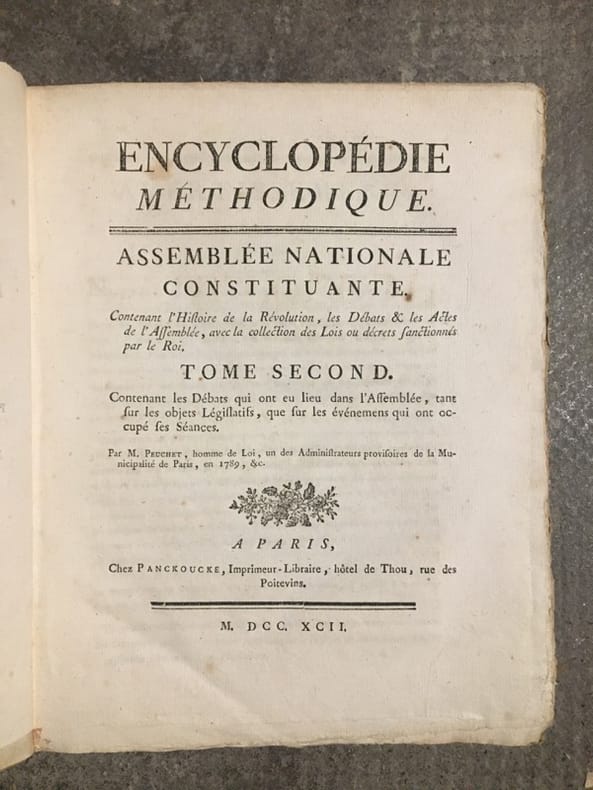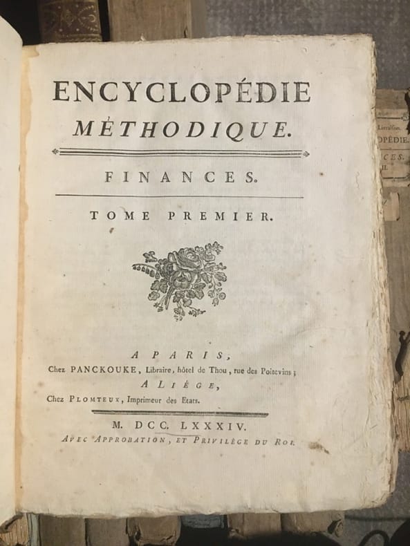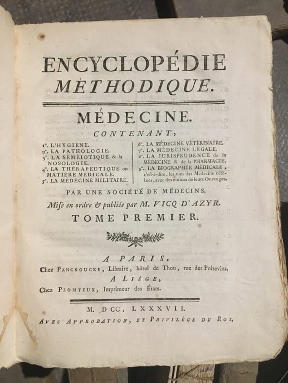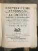 Monumentale encyclopédie fondée sur celle de Diderot et d'Alembert, avec l'objectif de l'améliorer. On visait ainsi à remédier au fractionnement jugé excessif de l'ouvrage de Diderot, qui obligeait "à lire cent articles pour avoir une idée suffisante d'un sujet. On voulut essayer si, en procédant différemment, l'analyse et la synthèse n'aboutiraient pas à une meilleure conciliation". Important ensemble, en condition du temps, tel que paru. Des volumes ont été mouillés, manques aux dos. Ci-après la liste des volumes (à noter que certains titres ne sont pas toujours complets, et que les atlas sont parfois manquant; liste détaillée et photo sur demande):GRAMMAIRE ET LITTÉRATURE. Paris, Liège, Panckoucke, Plomteux, 1782.JURISPRUDENCE. Paris, Liège, Panckoucke, Plomteux, 1782.COMMERCE. Paris, Liège, Panckoucke, Plomteux, 1783. GÉOGRAPHIE moderne. Paris, Liège, Panckoucke, Plomteux, 1783.MARINE. Paris, Liège, Panckoucke, Plomteux, 1783. ÉCONOMIE POLITIQUE ET DIPLOMATIQUE. Paris, Liège, Panckoucke, Plomteux, 1784.FINANCE. Paris, Liège, Panckoucke, Plomteux, 1784.ART MILITAIRE. Paris, Liège, Panckoucke, Plomteux, 1784.BOTANIQUE. Paris, Liège, Panckoucke, Plomteux, 1786.AGRICULTURE. Paris, Liège, Panckoucke, Plomteux, 1787.LOGIQUE ET METAPHYSIQUE. Paris, Liège, Panckoucke, Plomteux, 1787.MEDECINE: Paris, Liège, Panckoucke, Plomteux, 1787.ARCHITECTURE. Paris, Liège, Panckoucke, Plomteux, 1788.PHYSIQUE. Paris, Panckoucke, 1790.CHIRURGIE. Paris, Panckoucke, 1790. MUSIQUE. Paris, Panckoucke, 1791.ASSEMBLÉE NATIONALE CONSTITUANTE. Paris, Panckoucke, 1792.SYSTÈME ANATOMIQUE. Paris, Liège, Panckoucke, Plomteux, 1792. ANTIQUITÉS, MYTHOLOGIE, DIPLOMATIQUE DES CHARTRES ET CHRONOLOGIE. H. Agasse, an II. GÉOGRAPHIE PHYSIQUE. H. Agasse, an 3.Dictionnaire de toutes les espèces de CHASSES. H. Agasse, an 3.Dictionnaire des JEUX MATHÉMATIQUES. H. Agasse, an VII. HISTOIRE NATURELLE DES ANIMAUX:OISEAUX. Paris, Liège, Panckoucke, Plomteux, 1787POISSONS. Paris, Liège, Panckoucke, Plomteux, 1787.INSECTES-ENTOMOLOGIE. Paris, Panckoucke, 1790.HISTOIRE NATURELLE DES VERS. Paris, Panckoucke, 1792..