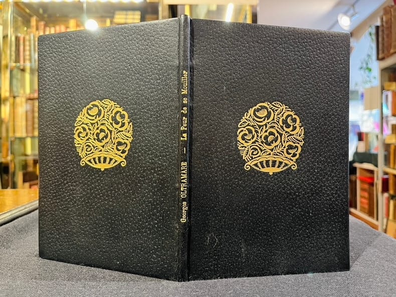 Genève, sans nom, 1955. Plaquette in-8 de 34-[2] pages, plein maroquin bleu nuit, dos lisse, centre des plats décorés d'un motif doré, couvertures illustrées et dos conservés., couverture imprimée. Reliure de René Kieffer, avec son étiquette.