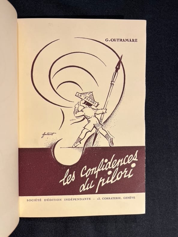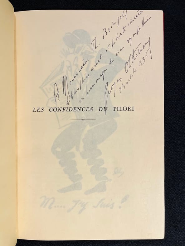 Avec de très nombreuses caricatures et dessins in-texte. Édition originale, un des 3 exemplaires numérotés sur papier bambou Japon (n°1), premier papier. Envoi autographe : " A Roger Noveraz, l'as, le numéro 1. Georges Oltramare, 19 octobre 1935". Bel exemplaire. Reliure signée au premier plat, mais hélas illisible pour les yeux du libraire.