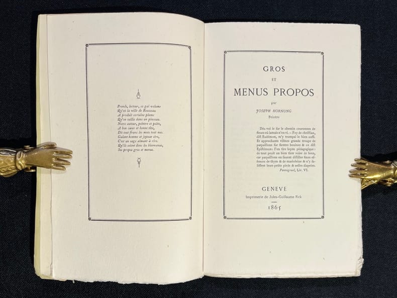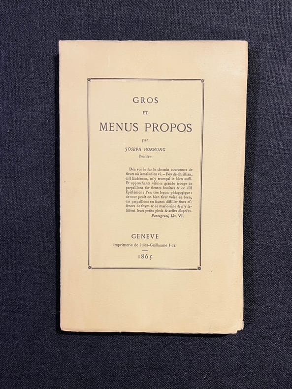 Édition originale. Exemplaire imprimé sur un beau papier vélin épais. " Son activité littéraire consiste en quelques Salons anonymes et un recueil, les Gros et menus propos, où sa veine bouffonne et son goût de la mystification se manifestent par des pastiches de la prose du XVIe siècle ou des écrits en patois savoyard. Marc Monnier verra en lui le «dernier Genevois, l’homme d’un autre siècle, un contemporain de Calvin et de Rabelais» (La Suisse illustrée, 10 avril 1872)." Philippe Junod: « Joseph Hornung », in SIKART Dictionnaire sur l'art en Suisse. Bel exemplaire.