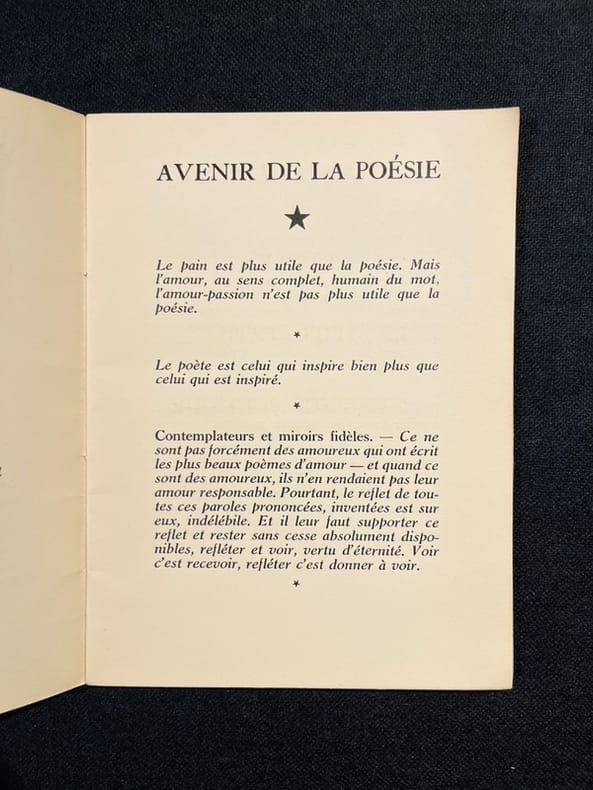 Illustré en couverture de la gravure "Grand air" de Pablo Picasso reproduite au trait. Édition originale. Il n'y a pas de tirage numéroté, le nôtre sur vélin (différent du précédent) et un feuillet double de papier bleu comportant entre autre le programme de la soirée du 2 octobre. [164].
