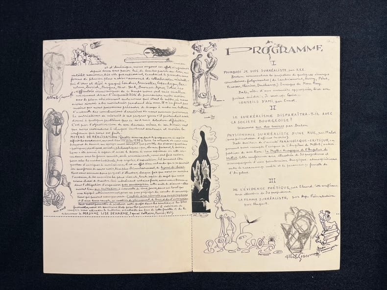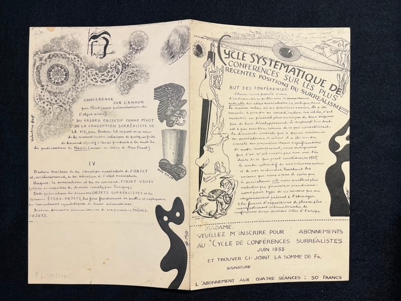 Carton d'invitation reproduisant en fac-similé le texte manuscrit de Breton et exposant le programme de quatre conférences surréalistes... qui n'eurent jamais lieu! Illustré des reproductions de dessins de Salvador Dali, Óscar Dominguez, Marcel Duchamp, Max Ernst, Alberto Giacometti (3), Valentine Hugo, Marcel Jean, Joan Miró, Man Ray (2), Yves Tanguy. Bien complet du coupon-réponse pré-perforé, à retourner à Lise Deharme. Tracts surréalistes et Déclarations collectives (1922-1969), t. I, p. 270; Vente Breton 2003, lot 1542.