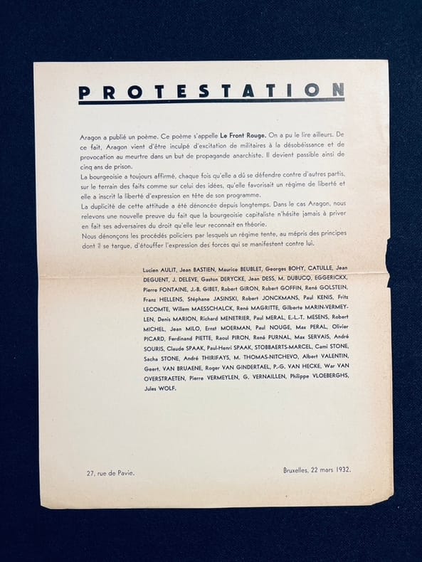 Tract de soutien à Aragon en réaction aux poursuite contre le poète dans le cadre de l'Affaire Aragon. IL est daté du 22 mars 1932. Les signataire sont Lucien Aulit, Jean Bastien, Marcel Beublet, Georges Bohy, Catulle, Jean Deguent, J. Delève, Gaston Derycke, Jean Dess, M. Dubucq, Eggerickx, Pierre Fontaine, J.-B. Gubet, Robert Giron, Robert Goffin, René Golstein, Franz Hellens, Stéphane Jasinski, Robert, Jonckmans, Paul Kenis, Fritz Lecomte, Willem Maesschalck, Paul Méral, E.L.T. Mesens, Robert Michel, Jean Milo, Ernest Moerman, Paul Nougé, Max Péral, Olivier Picard, Ferdinand Piette, Raoul Piron, Roland Purnal, Max Servais, André Souris, Claude Spaak, Paul-Henri Spaak, Stobbaerts-Marcel, Cami Stone, Sacha Stone, André Thirifays, M. Thomas-Nitchevo, Albert Valentin, Geert van Bruaene, Roger Van Gindertael, Paul-Gustave Van Hecke, War Van Overstraeten, Pierre Vermeylen, G. Vernaillen, Philippe Vloeberghs et Jules Wolf. Trace de pli central et légers manques marginaux. Tracts surréalistes et Déclarations collectives (1922-1969) I, pp. 228-229; First papers of surrealism, n°296.