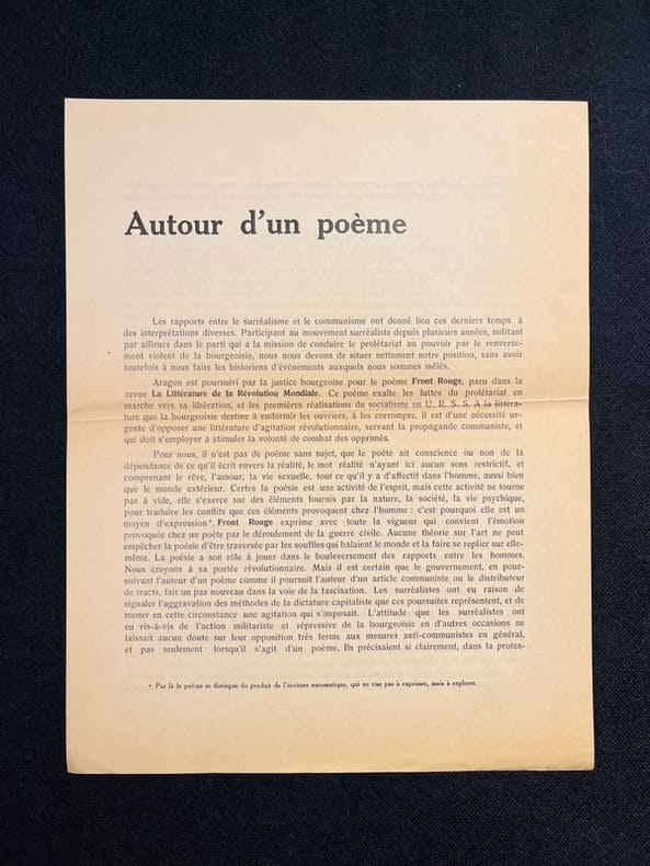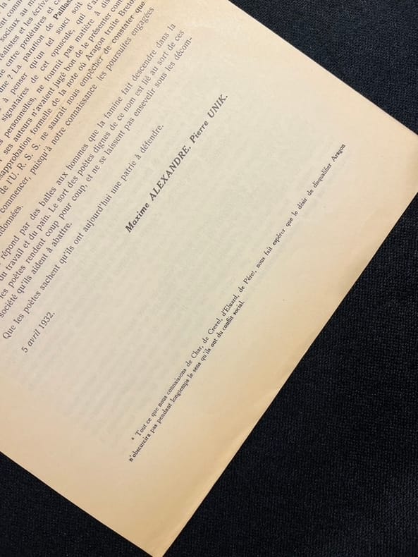 Édition originale de ce tract rédigé par Maxime Alexandre et Pierre Unik. Ils tentent de dresser un bilan objectif, se distançant de certains jugements excessifs tant de Breton que d'Aragon et estiment que les poètes "ont aujourd'hui une patrie à défendre". Quelques mois plus tard, Pierre Unik s’éloignera du surréalisme pour rejoindre l’Association des Écrivains et Artistes Révolutionnaires et se rapprochera du Parti communiste. Tracts surréalistes et Déclarations collectives (1922-1969) I, pp. 230-234, First papers of surrealism, n°299.