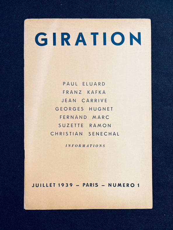 GIRATION. N° 1. (Juillet 1939). Paul Eluard, Franz Kafka (" L'Epée " et " Un Aphorisme ", traduits et commentés par Jean Carrive), Georges Hugnet, Fernand Marc, Suzette Ramon, Christian Sénéchal. /// Très bon état.