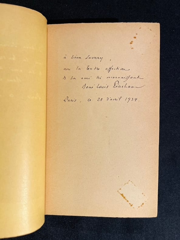 Tragédie représentée à la Comédie Française en décembre 1933, sous l'impulsion et la direction de Émile Fabre, qui fut destitué suite à cette pièce, sous prétexte qu'elle provoquait chaque soir des manifestations contre le gouvernement. Exemplaire agrémenté d'un envoi autographe " à Léon Savary avec la tendre affection de son ami très reconnaissant René-Louis Piachaud. Paris, ce 21 avril 1934.".