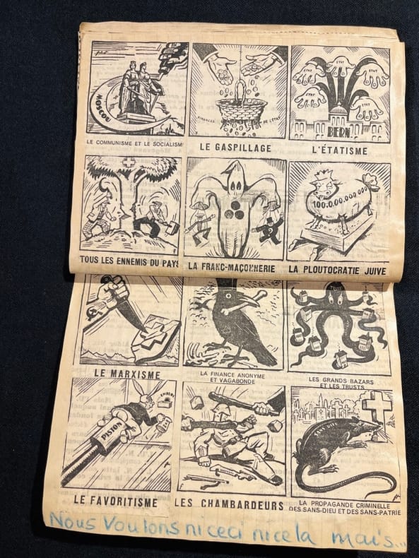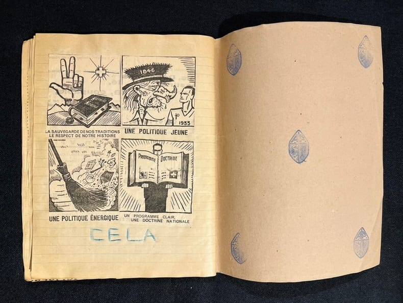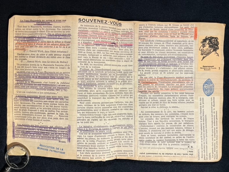 Recueil d'articles de journaux issus de la presse d'extrême-droite. Au menu: anticommunisme, antisémitisme, prose antimaçonnique, protectionnisme, etc. Tous les articles sont soulignés au crayon de couleurs, entourés du tampon encreur de l'association AJP. Le tout dans un cahier de l'Instruction publique du canton de Genève. Avec le nom du "rédacteur" à l'encre. Édifiant...