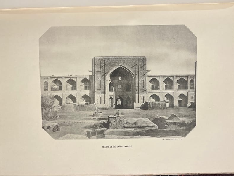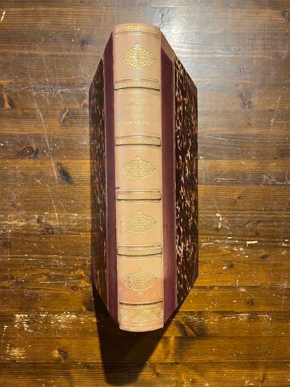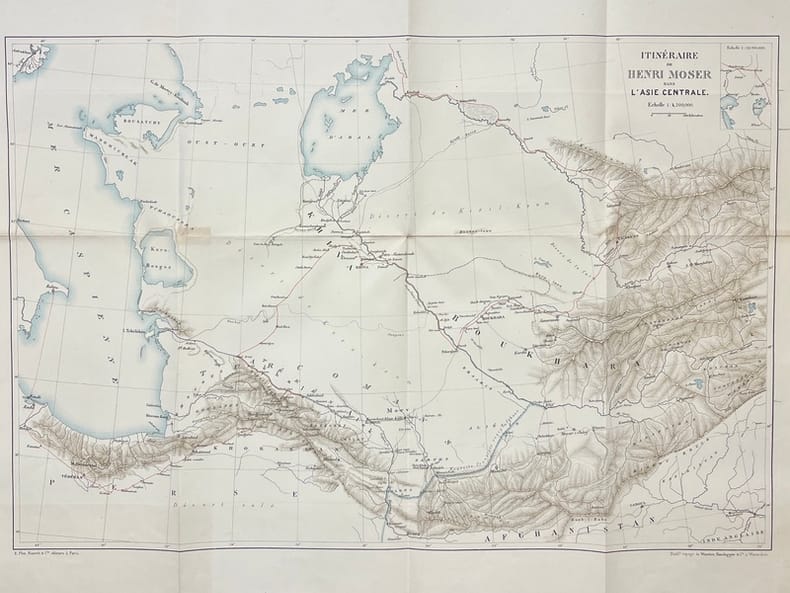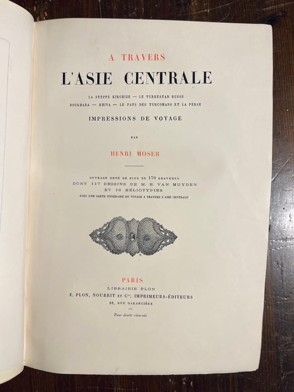 Paris, E. Plon, Nourrit, [1885], in-4, portrait-front, XI-463-[1] pp, 19 pl. sous serpentes, 1 carte depl, percaline bleu roi ornée en noir et or de l'éditeur, tranches dorées [A. Lenègre], Édition originale. Portrait-frontispice sur bois représentant l'auteur dans une tenue de chasseur d'Asie Centrale, 16 planches de reproductions photographiques en phototypie, 3 planches gravées sur bois, 1 grande carte dépliante lithographiée, avec indications colorées, donnant l'itinéraire du voyage ; en outre, l'ouvrage comprend de nombreuses illustrations dans le texte (gravures sus bois et reproductions photographiques). Henri Moser (1844-1923), né en Russie à Saint-Pétersbourg, fit ses classes en Suisse et parcouru la Sibérie à partir de 1866. Il entreprit plusieurs longs voyages en Asie centrale dès 1868 et réunit une importante collection d'objets ethnographiques et d'armes, dont il fit don en 1914 au Musée historique de Berne. Couverture rigide