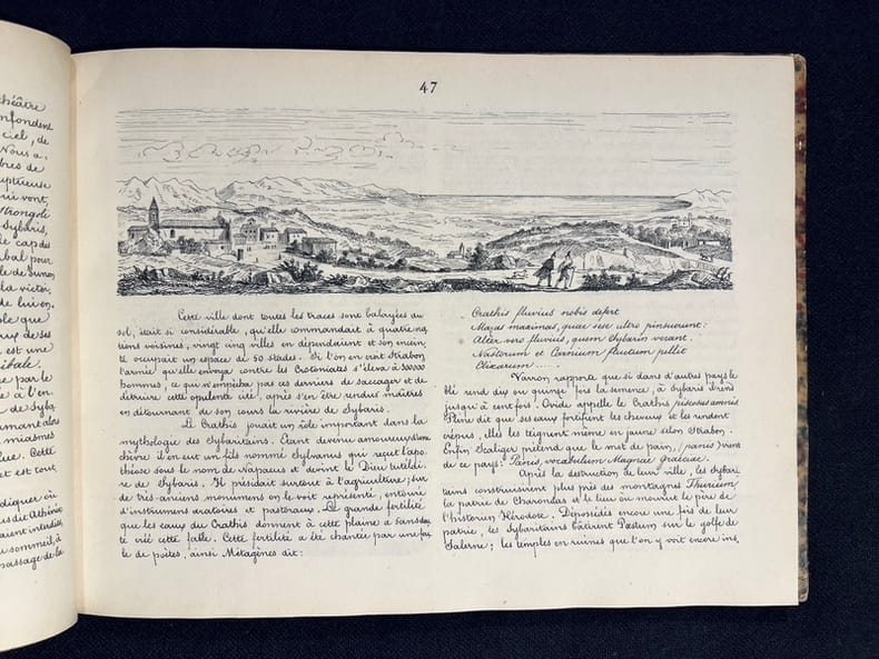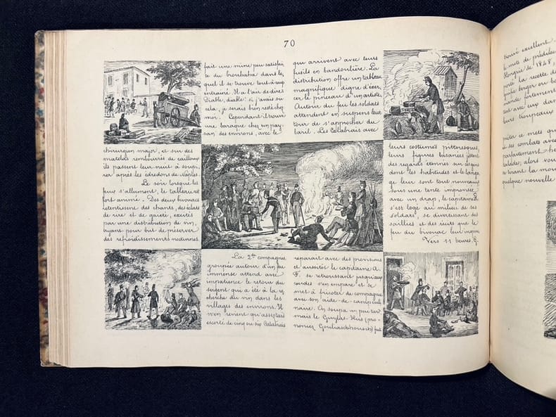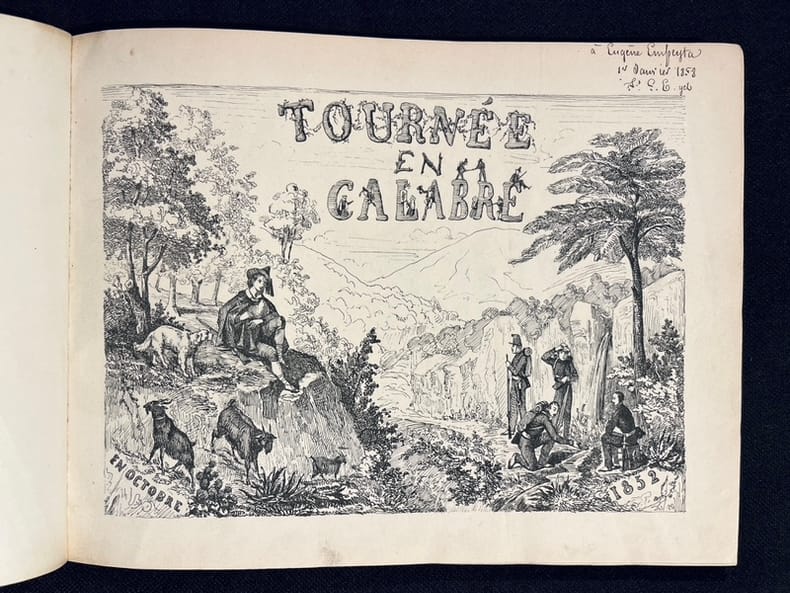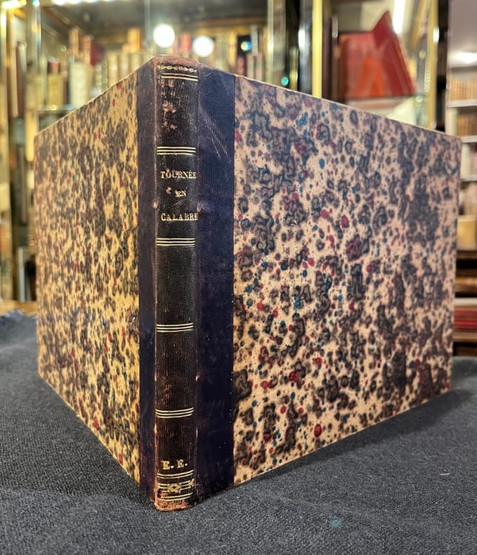 Singulière publication entièrement autographiée (texte et dessin) avec près de 200 dessins de l'auteur. Récit d'une expédition militaire du 26 septembre au 30 octobre 1852, par Louis-Horace Rilliet, chirurgien de son état. Il est surtout question de description des lieux visités, des populations rencontrées, des aventures de la troupe, de leurs repas plus ou moins copieux, le tout abondamment illustré! Un vrai journal de voyage entre le Basilicate et la Calabre. On ne peut ignorer l'influence de Rodolphe Töpffer en parcourant ces pages amusantes et curieuses. Le but premier de cette expédition était de suivre le Roi de Naples dans la région afin de lui porter secours en cas de nécessité, précaution qui fut inutile. Ex dono daté du 1 janvier 1858 sur la page de titre. Peu commun en reliure du temps.
