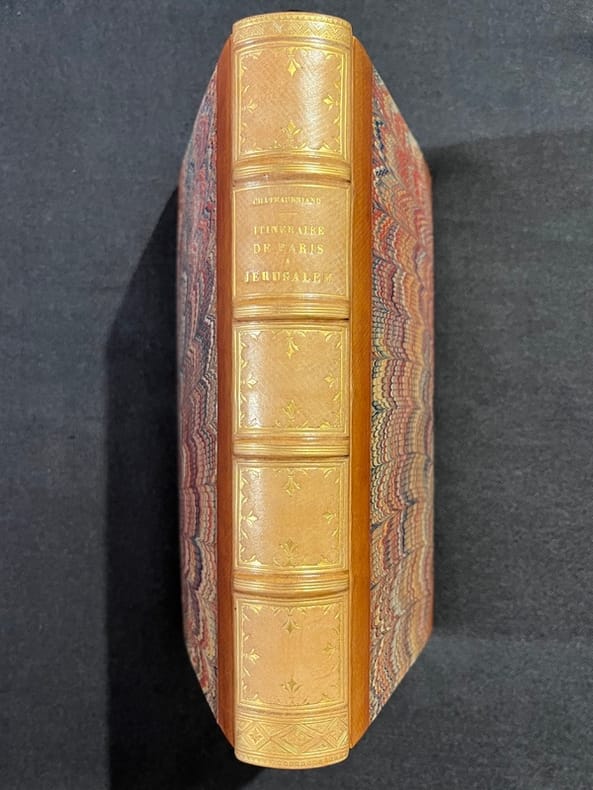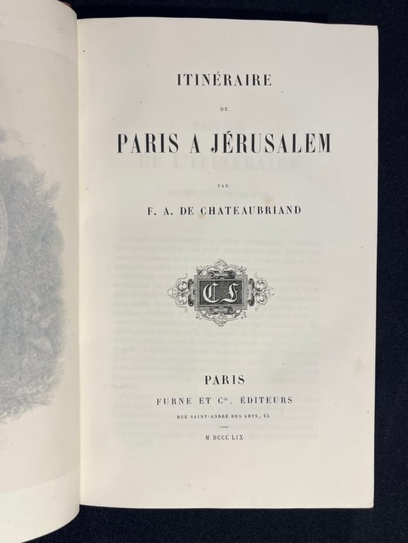 L'itinéraire de voyage de Chateaubriand de Paris à Jérusalem est bien documenté dans son célèbre récit de voyage intitulé "Itinéraire de Paris à Jérusalem" (publié en 1811). parcours résumé de son voyage aller-retour : Paris à Jérusalem (aller) : Paris, France : Chateaubriand a commencé son voyage à Paris. Suisse : Il a traversé la Suisse, s'arrêtant notamment à Genève. Italie : Il est ensuite entré en Italie, passant par Milan et Venise. Grèce : Chateaubriand a visité Athènes, où il a exploré les ruines antiques, notamment l'Acropole. Turquie (Constantinople) : Il est arrivé à Constantinople (l'actuelle Istanbul en Turquie), où il a séjourné un certain temps et a exploré la ville. Terre sainte (Jérusalem) : Son voyage l'a finalement conduit à Jérusalem, où il a visité les lieux saints du christianisme, y compris le Saint-Sépulcre. Jérusalem à Paris (retour) : Le retour de Chateaubriand de Jérusalem à Paris a suivi à peu près le même itinéraire, bien qu'il ait pu faire quelques détours et visites supplémentaires en chemin. Il est retourné en Europe par la voie terrestre, repassant par Constantinople, la Grèce, l'Italie, la Suisse, et enfin la France. Son "Itinéraire de Paris à Jérusalem" est un récit de voyage littéraire célèbre qui décrit non seulement les aspects géographiques de son voyage, mais aussi ses réflexions personnelles sur la religion, la politique et la culture. C'est un texte important de la littérature de voyage du 19e siècle. Complet, deux tomes en un volume relié demi cuir, 18x12, frottements, coins émoussés, tranches jaspées, bel état intérieur, 376, 419 pages. Paris,Firmain Didot, 1852 ref/102