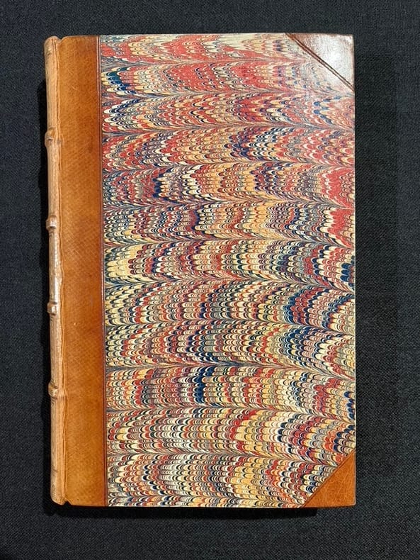 PARIS. LEFEVRE, LIBRAIRE-EDITEUR. LADVOCAT, EDITEUR. 1829-1830. 3 VOLUMES IN-8 (15 X 22,5 X 18 CENTIMETRES ENVIRON) RELIURE D'EPOQUE 1/2 VEAU ROUGE A COINS SOULIGNEE D’UN FILET DORE, DOS LISSE ORNE D'UN ELEGANT DECOR ROMANTIQUE A FROID ET DORE, TITRE DORE SUR ETIQUETTE MAROQUIN VERT, TRANCHES MARBREES. COMPREND :- ATALA. RENE. LES AVENTURES DU DERNIER ABENCERAGE. 1830. (4) + XXIV ET 376 PAGES. ILLUSTRE DE 4 GRAVURES SUR ACIER, DONT UNE EN FRONTISPICE, GRAVEES PAR BURDET D’APRES ALAUX.- ITINERAIRE DE PARIS A JERUSALEM, ET DE JERUSALEM A PARIS. 1829. 2 VOLUMES DE (4) + CLX + 350 ET (4) + 411 PAGES. ILLUSTRE D’UNE CARTE DE L’ITINERAIRE REPLIEE. «DE CETTE RANDONNEE MEDITERRANEENNE QUI NE FUT NI SANS CHARMES NI SANS PERILS, L'ITINERAIRE OFFRE UNE RELATION OU LES NOTATIONS PITTORESQUES LE DISPUTENT AUX REFLEXIONS HISTORIQUES ET AUX MEDITATIONS PHILOSOPHIQUES. DERRIERE LES TABLEAUX SOMPTUEUX DE L'ACROPOLE RAYONNANTE, DE LA TRISTESSE DE JERUSALEM ET D'ALEXANDRIE, DES DEBRIS DE SPARTE OU DE CARTHAGE, S'IMPOSE ENCORE UNE FOIS LE SENTIMENT D'UNE SENSIBILITE EXCEPTIONNELLE AUX GRANDS MOUVEMENTS DE L'HISTOIRE». (D. RINCE).QUELQUES PETITS DEFAUTS EXTERIEURS, SINON BEL EXEMPLAIRE DANS UNE JOILE RELIURE STRICTEMENT CONTEMPORAINE.