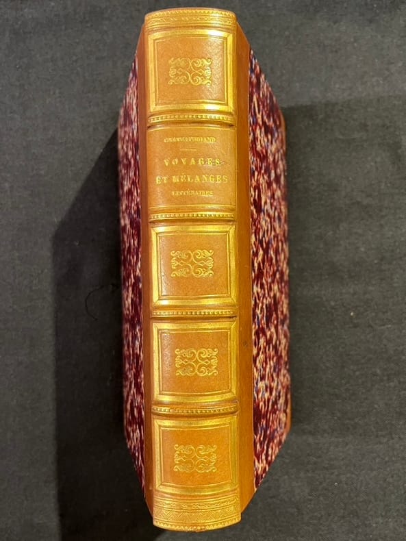 Paris, Garnier Frères, 1860 ; in-4, 590 pp., reliure demi-basane noir, dos à nerfs orné d'encadrements. Papier jauni pour les "Mélanges littéraires". François-René, vicomte de Chateaubriand, né à Saint-Malo, célèbre écrivain français de la première moitié du XIXème siècle, quitta la France en 1791 pour parcourir le Nouveau Monde, fuyant la Révolution. Pendant son voyage, il ébaucha notamment son poème Les Natchez (1826) puis revint en Europe en 1792 pour s’exiler en Angleterre. Chateaubriand tenta de montrer les beautés de la religion chrétienne, la véritable religion, qui avait été pervertie selon lui par les Lumières et la Révolution française. Illustré de vignettes gravées par Outhwaite, Aubert, etc. Bon état.