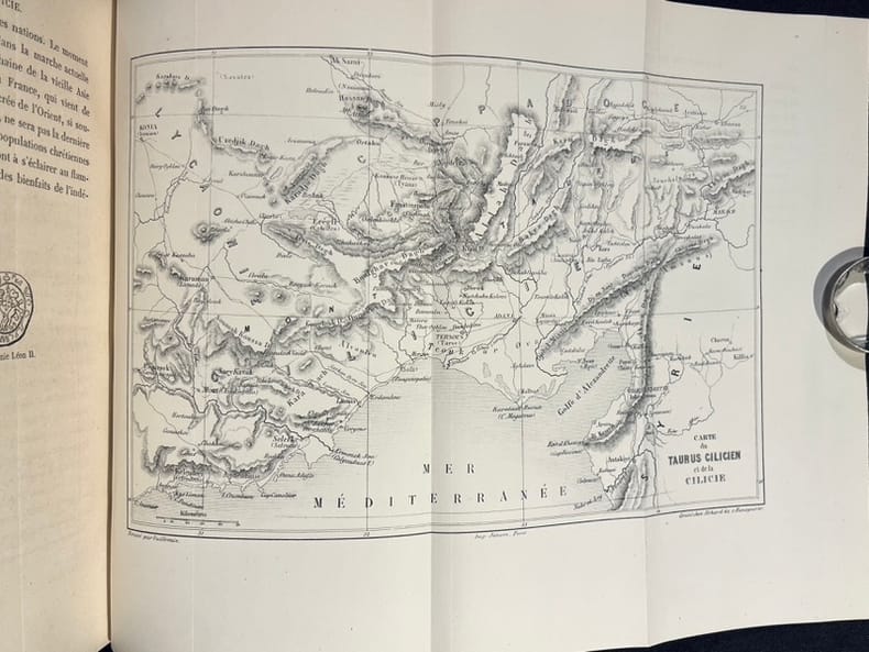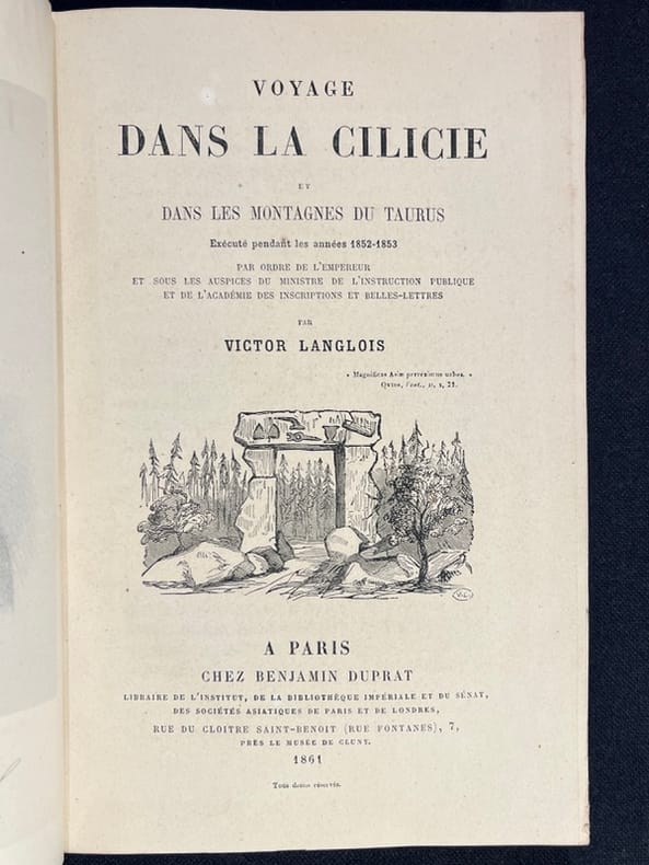 héologique en 1852 dans les montagnes du Taurus en Asie Mineure. Il était l'un des rares Européens à avoir visité la région du Taureau au 19ème siècle. Il traite principalement de la « Petite Arménie », avec la description de la région, la topographie, l’histoire naturelle, les habitants, langues, religions, commerce, industrie manufacturière, agriculture, gouvernement et histoire. Les antiquités de chaque site et ville sont décrites séparément et à la description se joignent des notices historiques de chaque lieu. Victor Langlois (1829-1869), numismate orientaliste. Diplômé de l'École des Chartes et de l'École des langues orientales. Spécialiste de l’histoire, de la numismatique, de l’histoire des civilisations de l’Arménie et de la Cilicie arménienne. Il est auteur d’une trentaine d’ouvrages, dont deux volumes de traductions des premiers historiens arméniens. Chadenat 618. M2-Et2