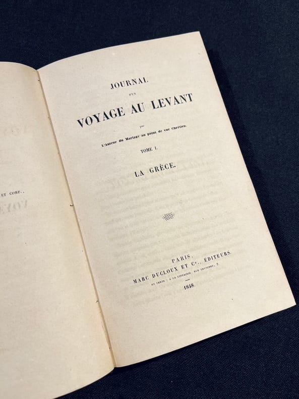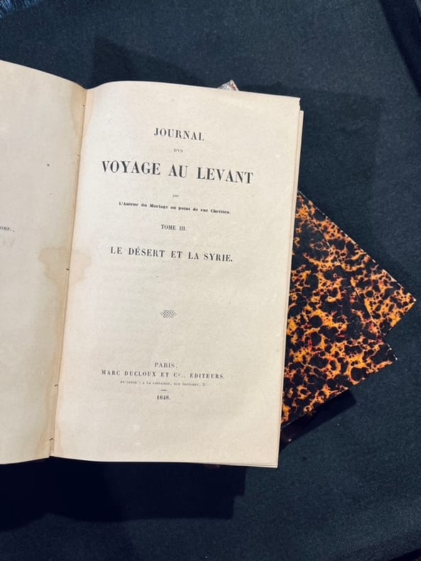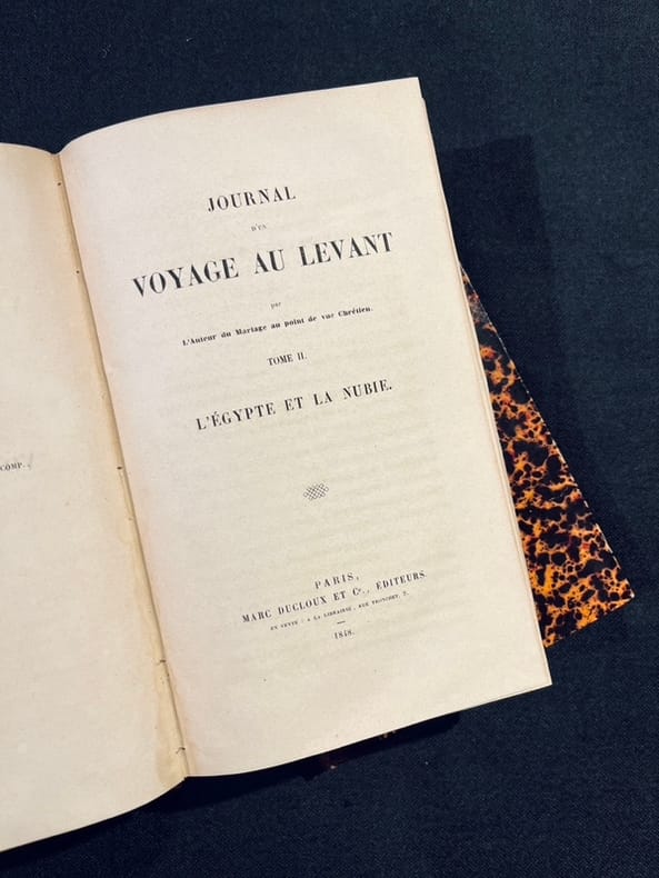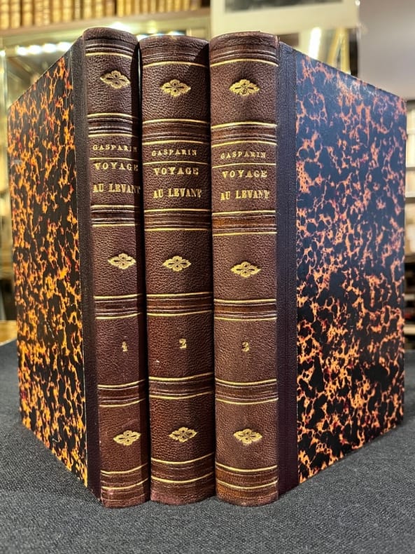 Édition originale. Importante relation de Valérie de Gasparin offrant au lecteur plus de 1300 pages d’observations attentives des paysages, des populations, des sites archéologiques, des coutumes et des traditions religieuses rencontrées, sans omettre les informations pratiques, sur le mode d’un guide de voyage. Le premier volume est consacré à la Grèce, le deuxième à l'Égypte et la Nubie, au désert et à la Syrie. Bien complet des errata. Bel exemplaire de ce récit des plus rares. Hage-Chahine 1797.