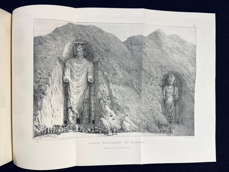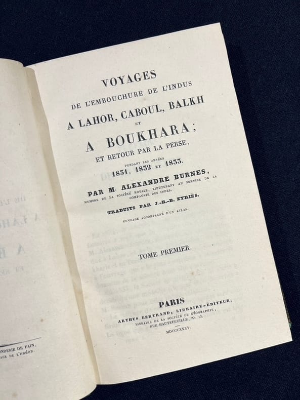 Paris Arthus Bertrand 1835 3 volumes in-12 et un volume in-8 pour l'atlas, demi-veau beige, plats de papier marbré, dos à nerfs ornés de filets poussés or et à froid; doublures et gardes de papier crème, tranches lisses (reliures de l'époque).Edition originale de cet ouvrage qui donne de précieux renseignements sur l'Afghanistan au début du XIXe siècle, et qui est accompagné d'un atlas de 11 planches lithographiées et d'une grande carte repliée indiquant le voyage de l'auteur. Bel exemplaire.