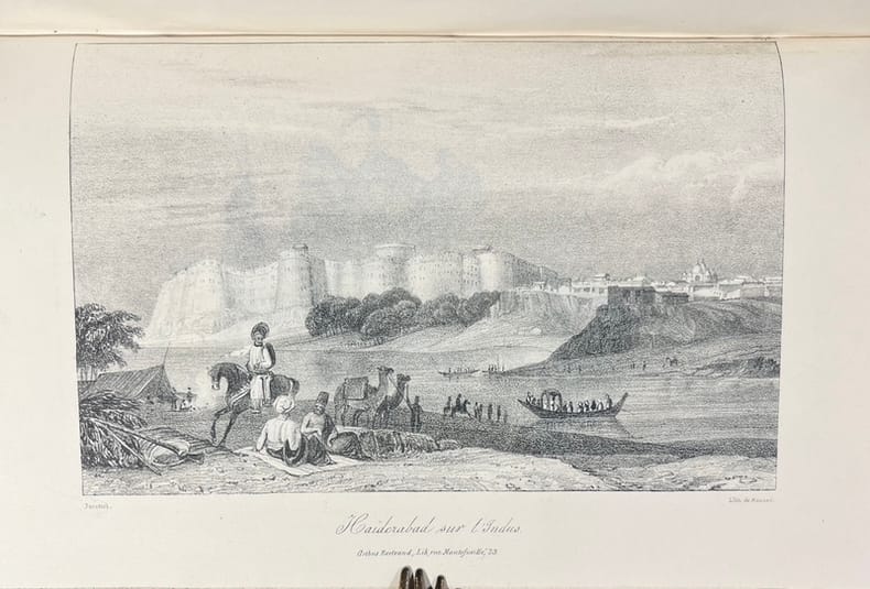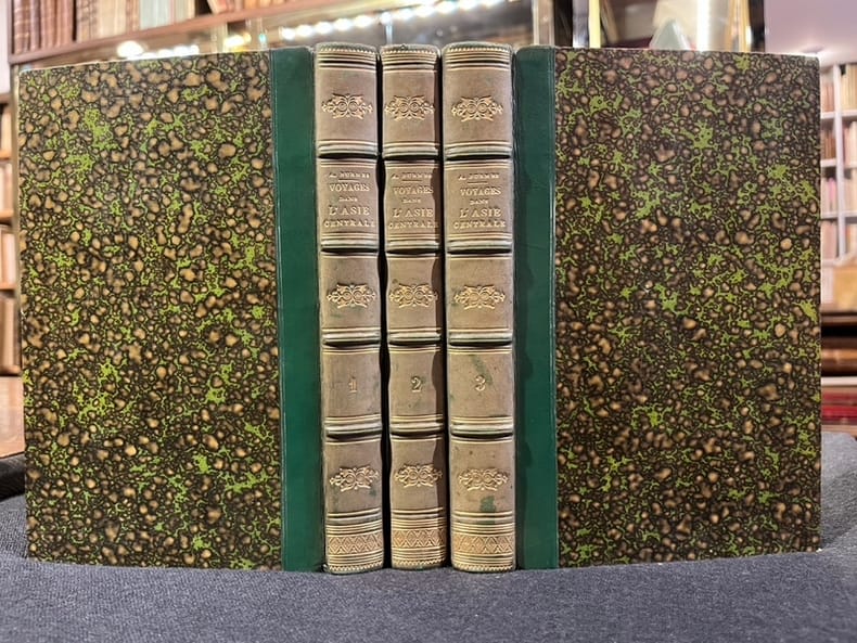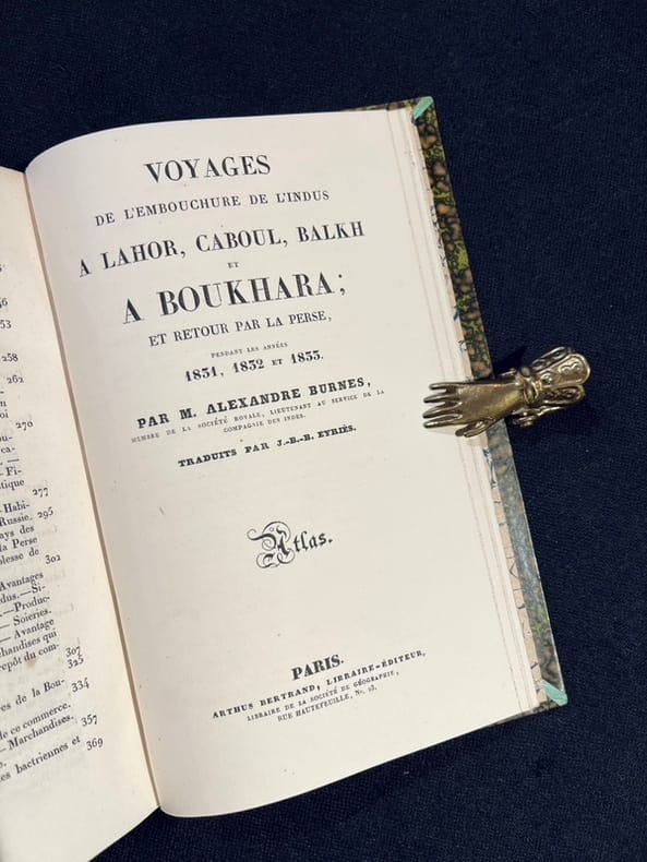 Avec l'atlas relié à la fin du troisième volume composé de 11 planches lithographiées, sans la carte. Édition originale de la traduction française (la première édition anglaise parue l'année précédente). "Envoyé comme cadet aux Indes (1821), Alexander Burnes était, dès 1828, second chef de l'état-major, il explora les bords de l'Indus. Connaissant les langues indigènes, il fut, en 1830, chargé d'une mission auprès du radjah de Lahore, Ranjit Singh. Il réussit dans cette mission et obtint l'autorisation de faire un voyage en Asie centrale. Accompagné du médecin militaire James Gerard, il explora le Turkestan, Balkh et Boukhara, revint en janvier 1833 par la Perse." wiki. Rare dans cette condition. Hage-Chahine 720.