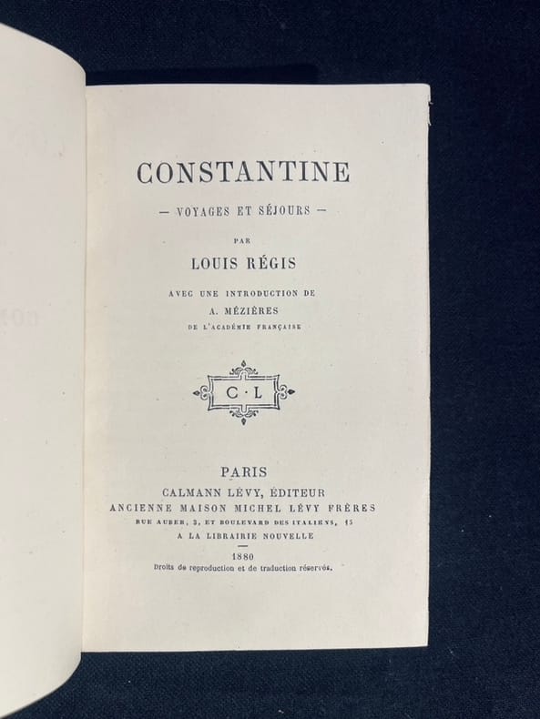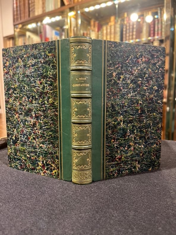 Édition originale. Contre tout attente, Louis Régis est un femme dont on ne sait rien, hélas. "Cette excursion si bien racontée fait partie d'un voyage à travers l'Algérie qu'on nous donne ici tout entier. Les lecteurs y reconnaîtront partout la même précision élégante et la justesse de ton. Les tableaux de moeurs algériennes s'y succèdent naturellement à mesure qu'ils se présentent aux yeux de l'aimable voyageuse. [...] Grâce à son sexe et à la durée d'un long séjour à Constantine, notre auteur a pu entrer en relations suivies avec les femmes arabes, dont elle décrit les moeurs, d'après des observations personnelles qui n'avaient point encore été faites avec la même sûreté. C'est la partie la plus originale de son oeuvre." Préface. L'auteure critique les colons et le préfacier termine ainsi: " Louis Régis nous permettra-t-elle une seule objection ? Ne juge-t-elle pas avec trop de sévérité les colons algériens ? Nous croyons volontiers tout le bien qu'elle nous dit des Arabes; mais nous voudrions qu'elle eût meilleure opinion de nos compatriotes, et nous sommes quelquefois tenté de les défendre contre elle." Bel exemplaire très frais.