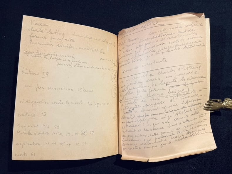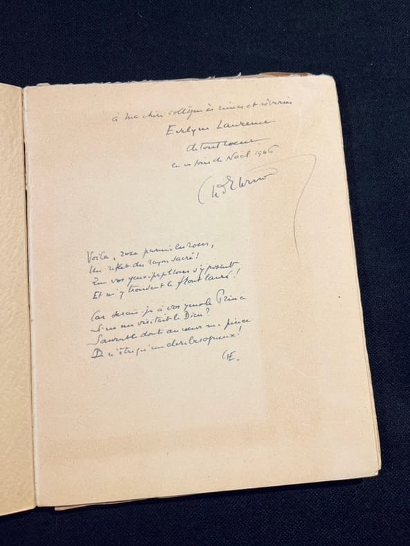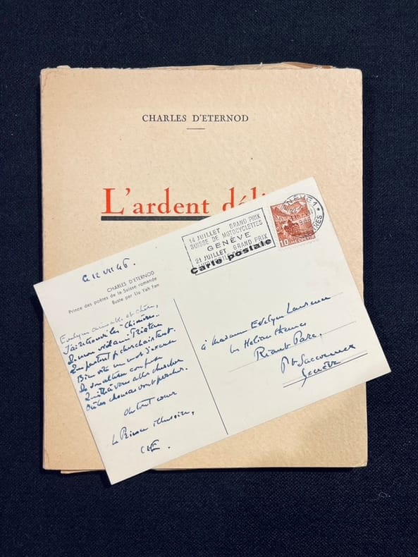 Vignette et portrait par le peintre Gustave François. Édition originale tirée à 630 exemplaires, celui-ci un des 600 sur vélin bouffant sans bois (124). Jolie impression bicolore. Avec un envoi autographe signé de l'auteur "à ma chère collègue ès rimes et rêveries Évelyne Laurence de tout coeur en ce soir de Noël 1946 Ch. d'Eternod", suivi d'un poème en 8 vers rimés. On joint une carte postale du même à la même. Avec des annotations de la dédicataire sur un feuillet volant (collé avec unpoint de colle) et le dernier feuillet blanc.