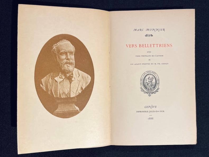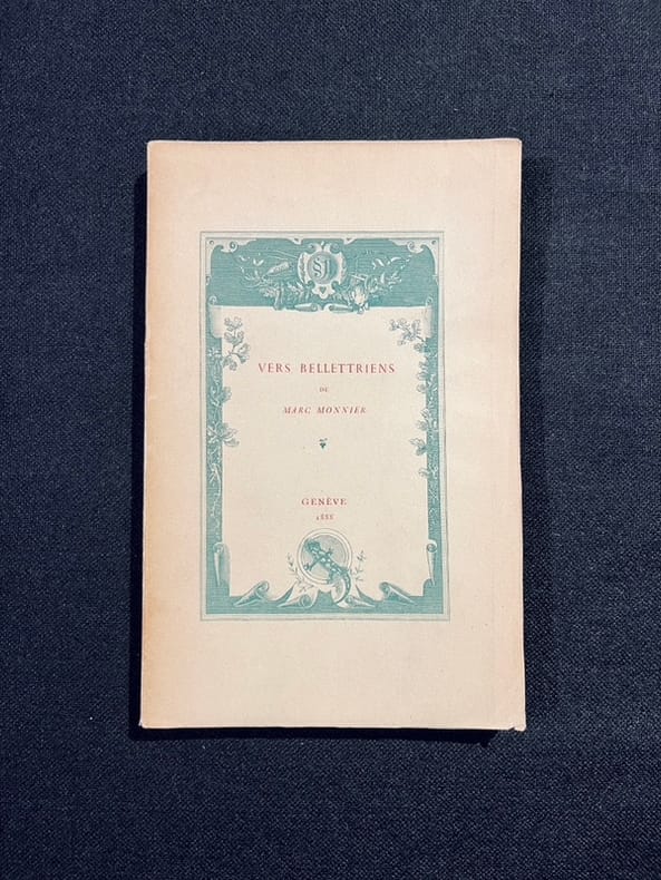 Illustré de 3 portraits hors-texte de l'auteur (dont deux imprimés sur Japon) et d'une page en fac-similé autographe. Édition originale."L'idée de publier les poésies composées par Marc Monnier pour la Société de Belles-Lettres a surgit spontanément dans plusieurs coeurs belletriens, au moment où l'on se préparait à fêter l'inauguration de son buste à l'Université de Genève. " Avis au lecteur. Bel exemplaire tel que paru, non coupé. Infime manque au dos.
