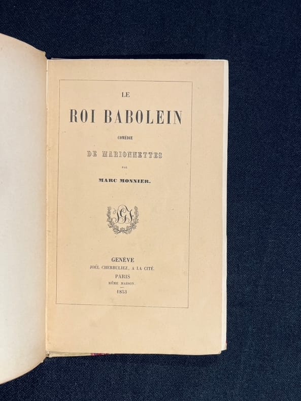 Édition originale. "Le Roi Babolein est la seule pièce pour marionnettes de Marc Monnier qui prenne la forme d'une simple comédie, détachée de l'actualité politique. C'est une fable morale à la leçon explicite: quelle que soit sa place dans l'ordre social, personne n'est complètement libre ni complètement heureux." Puppet Plays. Des bibliothèques de Frédéric Raisin, puis Edmond Chenevière, avec leurs ex-libris.