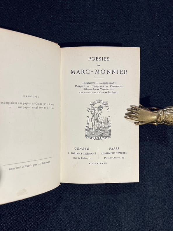 Genève, S. Jolimay-Desrogis, Paris, Alphonse Lemerre, 1872. In-18 de [4]-259 pages, demi-chagrin brun, dos à nerfs.