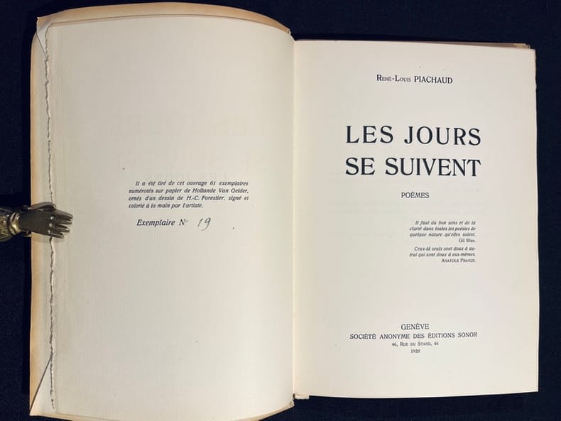 Genève, Société anonyme des étidtions Sonor, 1920. In-8 de [4]-96-[4] pages, demi-percaline rouge, titre et filets dorés au dos, couvertures conservées.