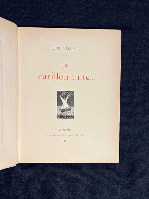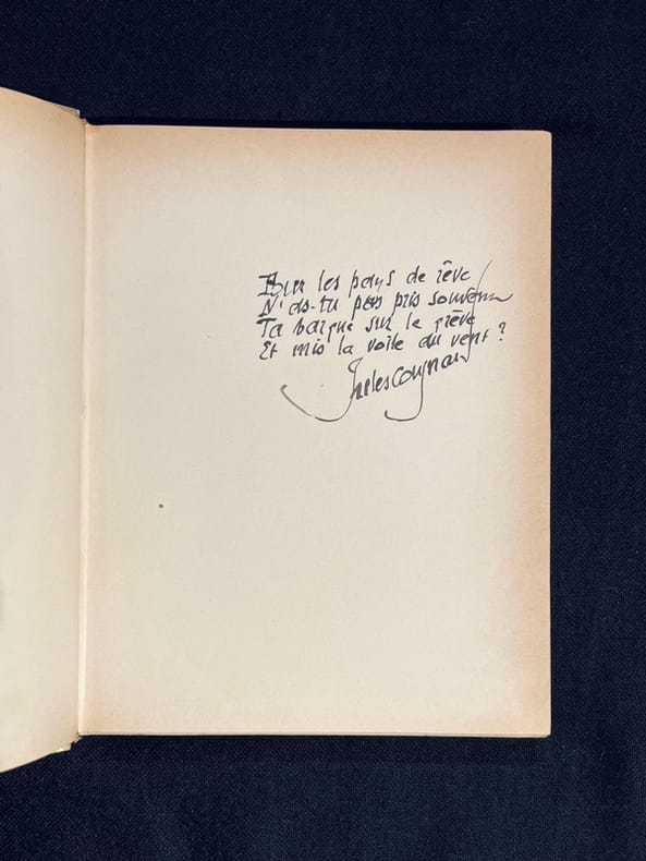 Illustré d'un portrait de l'auteur au frontispice. Édition originale de ce recueil que l'on doit au poète genevois, au tirage limité à 364 exemplaire, celui-ci un des 350 sur vélin. Avec un beau poème autographe manuscrit : "Pour les pays de rêve / N'as-tu pas pris souvent / Ta barque sur la grève / Et mis la voile au vent? Jules Cougnard" De la bibliothèque d'Edmond Chenevière, avec son ex-libris. Fort peu courant.