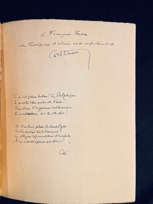 Vignette et portrait par le peintre Gustave François. Édition originale tirée à 630 exemplaires, celui-ci un des 600 sur vélin bouffant sans bois (442). Jolie impression bicolore. Avec un envoi autographe signé de l'auteur François Fosca, essayiste, critique d'art et romancier mais également peintre et illustrateur à ses début. François Fosca est le pseudonyme de Georges de Traz qui écrivit également sous le nom de Peter Coram des romans policier. L'envoi de Charles d'Éternod est suivi d'un poème en huit vers.