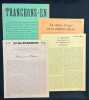 Rares documents, outre l'affiche-tract "Tranchons-en" on trouve les trois communiqués adressés à la presse publiés à l'occasion de la onzième exposition internationale du surréalisme. Les rédacteurs "soucieux de simplifier au maximum la tâche de MM. les journalistes" leur offraient ainsi, à choix, un texte correspondant à leur tendance: bienveillance (Filles de joie et Publicains), incertitude (Le chou rouge et la chèvre noire) ou hostilité (Le capharnaüm obscurantiste ou les égarements de l'intelligence). En parfaite condition.