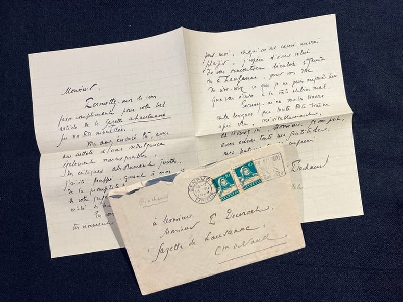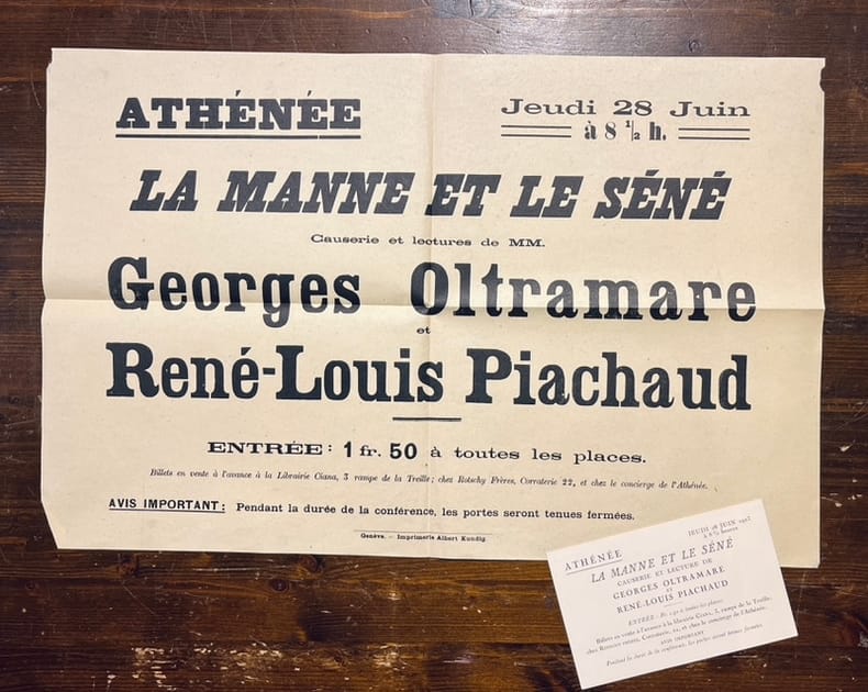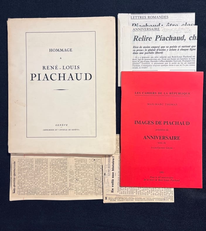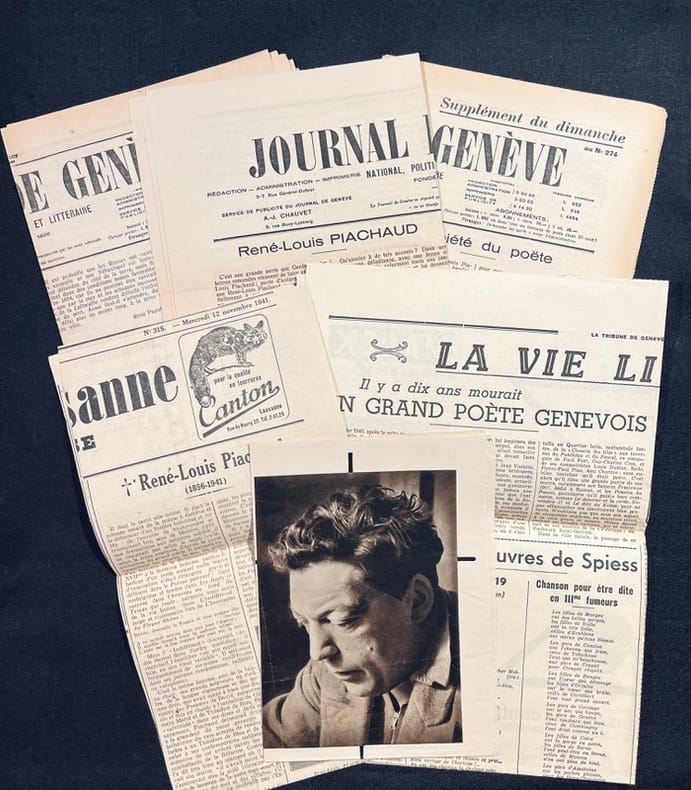 Lettre autographe de 2 pages, signée et datée du 13 juillet 1929, adressée à P. Decorvet, rédacteur de la Gazette de Lausanne, concernant les Fêtes "mouillées" de juillet. Affiche sur papier pelure jaune de la conférence de René-Louis Piachaud et Georges Oltramare: "La manne et le séné causerie et lecture" qui a eu lieu à l'Athénée le 28 juin 1923. On joint deux portraits: une photographie signée de Fred Boissonnas et un dessin de Petrovic. Trois n° du Journal de Genève dont deux suppléments du dimanche consacré à R.-L. Piachaud. (n° 274). Un article de l'Illustré, de la Tribune de Genève et de la Gazette de Lausanne consacrés à la disparition de l'auteur.