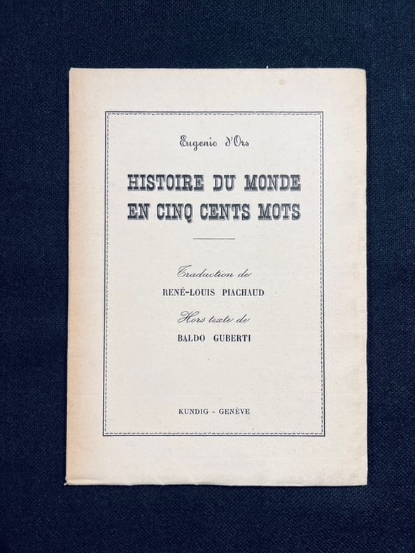Illustré d'un portrait de l'auteur par Baldo Guiberti. Édition originale de la traduction française, tirée à 400 exemplaires numérotés. "Eugenio d'Ors paria un jour qu'il pourrait écrire l'histoire du monde en cinq cents mots. Mis au défi de s'exécuter, le grand écrivain espagnol entreprit la besogne et, des Atlantides jusqu'à nos jours, ramassa d'un puissant coup le monde dans sa main. Le compte y était: cinq cents mots pour condenser des centaines de milliers d'années. Décidément, les hommes sont peu de chose.A son tour, René-Louis Piachaud, qui vient de traduire cet opuscule, s'en est tenu à cinq cents mots français, performance d'autant plus remarquable qu'il a merveilleusement trouvé l'équivalent du style épigrammatique et lapidaire d'Euge nio d'Ors. Le petit livre qui sort de presse, orné d'un beau frontispice de Balbo Guberti et imprimé par Kundig, semble gravé dans la pierre." un article du 23.10.38.