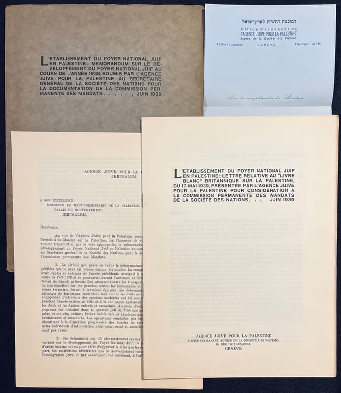 On joint: " L'établissement du Foyer national juif en Palestine : lettre relative au "Livre blanc" britannique sur la Palestine, du 17 mai 1939, présentée par l'Agence Juive pour la Palestine pour considération à la Commission permanente des mandats de la Société des Nations" 16 pages agrafées édité par l'Agence juive en juin 1939; et un mémorandum sur le développement du Foyer National Juif en Palestine au cours de l'année 1938 adressé à son excellence monsieur le haut commissaire de la Palestine, Palais du Gouvernement, Jérusalem, daté du 17 mai 1939 et signé par Ch. Weizmann, présidente de l'Agence juive pour la Palestine.