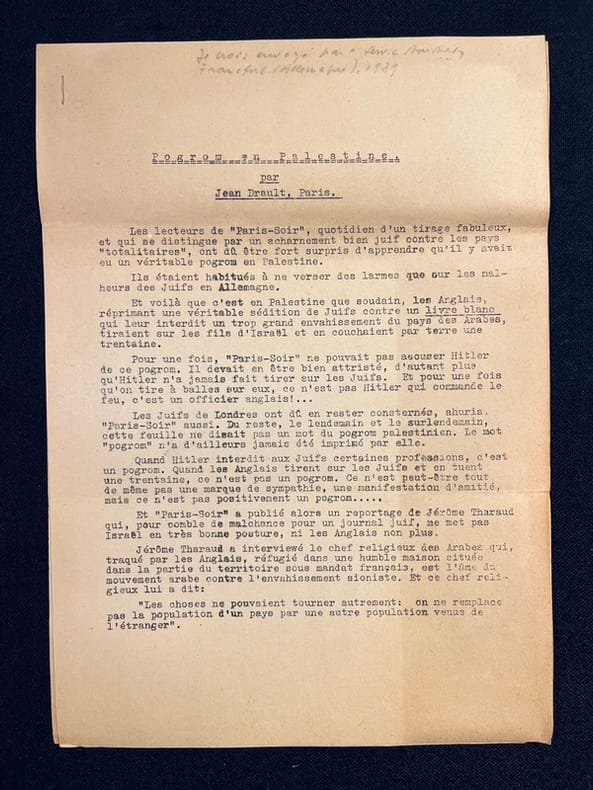 Article de Jean Drault où il est question de la sédition de juifs contre le Livre Blanc qui fit des morts; et de la couverture qu'en fit Jérôme Tharaud dans un article du "Paris Soir".