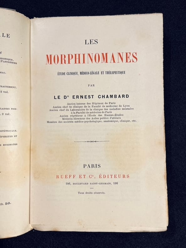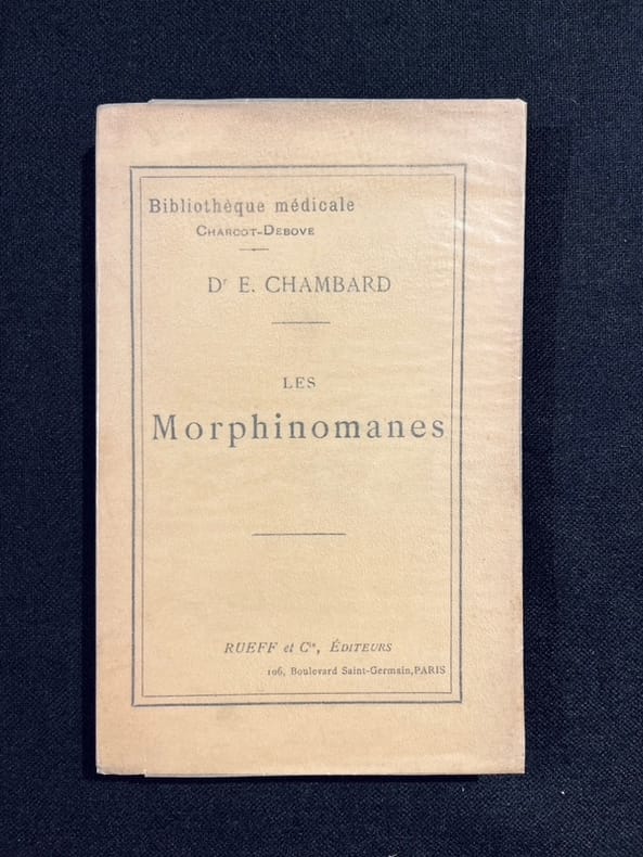 Édition originale. Le Dr Ernest Chambard (1851-1900) était un médecin français connu principalement pour son ouvrage de 1890, Les Morphinomanes. Etude clinique, médico-légale et thérapeutique, une publication pionnière sur la morphinomanie qui analysait le sujet d'un point de vue clinique, médico-légal et thérapeutique, contribuant aux discussions médicales et sociales de l'époque sur les toxicomanies. Son travail a marqué l'étude scientifique et juridique de la dépendance aux opioïdes à une époque où ce sujet était encore peu compris. On trouve à la fin de l'ouvrage 8 pages de réclames imprimées en vert et noir. Ce volume fait parti de la "Bibliothèque médicale" publiée sous la direction de J.-M. Charcot et G.-M. Debove. Bel exemplaire, malgré quelques pâles rousseurs.