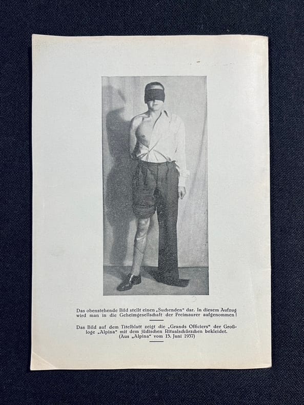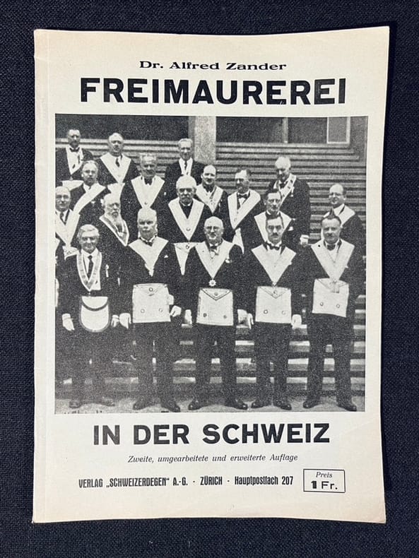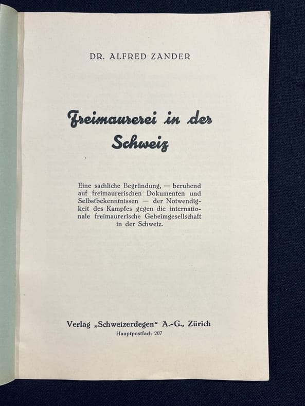 Alfred Zander fut un militant radical de l'extrême droite à partir des année 30: il dirigea le "Nationalen Front", un mouvement d'orientation national-socialiste en Suisse. Il fonde un groupe encore plus radical, le «Bund treuer Eidgenossen» (BTE). L’organisation s’est rapidement distinguée comme la plus radicale de tous les groupes de droite de ces années. Il fera de la prison a plusieurs reprise, et en 1941 quitte la Suisse pour l'Allemagne et s'enrolera dans les Waffen-SS... "Une belle ordure" comme m'a dit une connaissance. Notre document fut publié par sa propre maison d'édition et représente un des sujet classique des fascistes et nazi, l'antimaçonnisme.