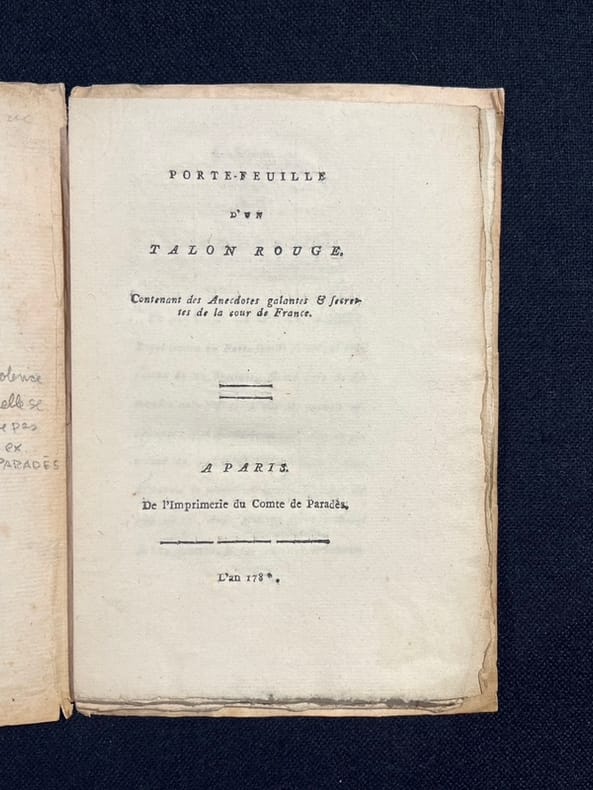 "Très rare édition originale de ce ""Libelle contre toute la cour"" et singulièrement contre Marie-Antoinette. Comme le précise Manuel dans La Police de Paris dévoilée, ""Toute l'édition ou à peu-près"" fut saisie avant sa mise en vente, placée à la Bastille et, sur décision du lieutenant de police Lenoir, du 13 mai 1783, envoyée au pilon. Selon les codes rhétoriques en vigueur au XVIIIe siècle, ce pamphlet se présente comme des papiers personnels anonymes, trouvés au Palais-Royal. Il contient deux lettres, la première adressée à l'académicien La Harpe, et la seconde à ""Milady St…"". Dans la première partie, sous couvert de disculper la Reine des ""sottises que la méchanceté publie à Paris"" contre elle, l'auteur de ces prétendues missives énumère complaisamment tous ces calomnies diffamatoires. Parmi les premiers libelles prérévolutionnaires dirigés contre Marie-Antoinette - il est daté du 13 juin 1779 -, le Porte-Feuille d'un talon rouge rassemble les principales accusations qui la vise dont sa conduite scandaleuse, le détail de ses favorites et sa supposée liaison avec Madame de Polignac. Dans la seconde partie du Portefeuille, sont également visés plusieurs hauts personnages de la Cour : Maurepas, le duc de Chartres - futur Philippe-Égalité -, ou le comte d'Artois, frère du Roi. De l'Imprimerie du Comte de Paradès Malgré plusieurs propositions d'attribution, l'auteur du Porte-Feuille d'un talon rouge demeure aujourd'hui encore anonyme. Le nom du Comte de Paradès qui apparaît au titre évoque un aventurier, fils d'un pâtissier de Phalsbourg, se prétendant descendant d'un Grand d'Espagne, espion et chevalier d'industrie au service de la France, embastillé entre 1780 et 1781. Il n'est mentionné qu'à titre ""publicitaire"", sans avoir part à l'ouvrage. The ""popular"" images of the queen, had their origin in the court, not in the streets (Lynn Hunt, The many bodies of Marie-Antoinette, 2003) Les premières pages du Porte-Feuille sont particulièrement célèbres, puisque y est décrit avec précision le mécanisme de création et de diffusion des libelles à la fin de l'Ancien Régime : ""Un lâche Courtisan les ourdit dans les ténèbres ; un autre Courtisan les met en Vers & en Couplets ; & par le Ministère de la Valetaille les fait passer jusqu'aux halles & aux marchés aux herbes. Des halles elles sont portées chés l'artisan, qui a son tour les rapporte chés les Seigneurs qui les ont forgés […]"". Tourneux signale des exemplaires aux ventes Chaponay (1863) et L. Potier (1870), ainsi qu'à celle du relieur Capé ""où il s'en retrouva jusqu'à 21 exemplaires en feuilles qui, achetés par un libraire du quai des Grands Augustins et reliés par ses soins, sont peu à peu entrés dans la circulation"". Très bel exemplaire. Ex-libris Jules Couët, bibliothécaire-archiviste de la Comédie française. Ses livres furent dispersés à travers 10 ventes entre 1936 et 1939. Gay, Bibliographie des ouvrages relatifs à l'amour, aux femmes et au mariage, III, 821 - Pascal Pia, Les Livres de l'enfer, 1166. - P. Jammes, Le Bûcher bibliographique, n° 462. - M. Tourneux, Marie-Antoinette devant l'Histoire, n° 69."