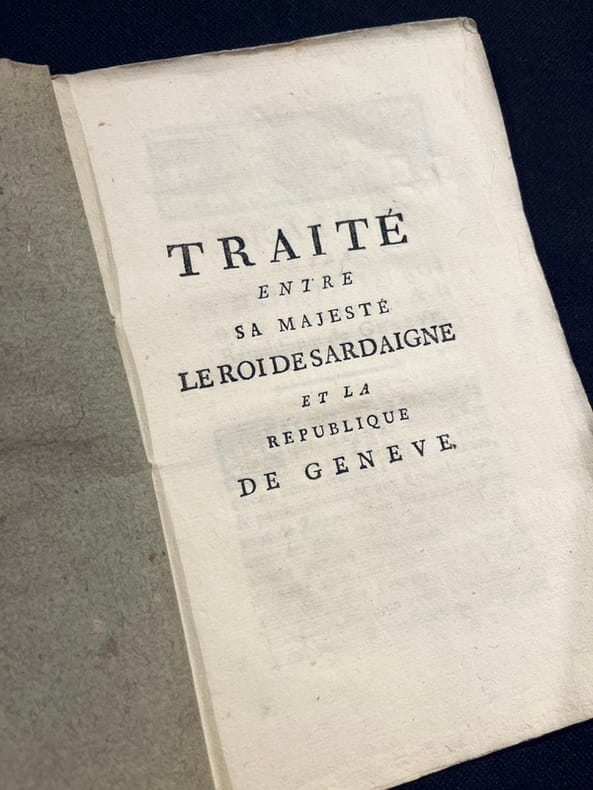 Ce traité concerne la limitation des deux territoires et l'échange de divers droits entre les deux Etats ; il est daté de Turin, le 3 juin 1754, et signé par Foncet de Montailleur et Mussard. Il est suivi des pièces ci-après : 1. Verbal joint au traité, du même jour, convenant les détails de limitation. - 2. Plein-pouvoir de Sa Majesté, du 1er juin 1754. - 3. Plein-pouvoir de la République de Genève, du 30 mai 1754. - 4. Ratification de S. M. Charles Emmanuel, du 15 juin 1754. - 5. Ratification de la République de Genève, du 13 juin 1754. - 6. Déclaration de Sa Majesté, du 15 juin 1754, pour l'exemption de la douane, et du logement des gens de guerre, en faveur des citoyens et bourgeois de Genève, pour leurs maisons appelées de l'Ancien dénombrement. 7. Acte de cession des droits de fief, dixmes & autres revenus, de l'ordre des Saints Maurice et Lazare, soit de la Commanderie de Saint Jean, faite par Sa Majesté le Roi de Sardaigne à la République de Genève. Daté de la Vénerie (Venaria Reale) le 18 juin 1754. - 8. Acte d'entérinement de la cession ci-dessus. Daté de Turin le 18 juin 1754. Rivoire 601.