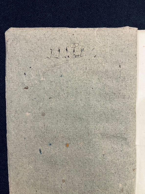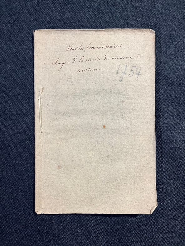 Genève, [1754?]. Brochure in-8 de 38 pages, couverture de papier gris avec un inscription à la plume: Pour les commissaires chargés de la remise du nouveau territoire.