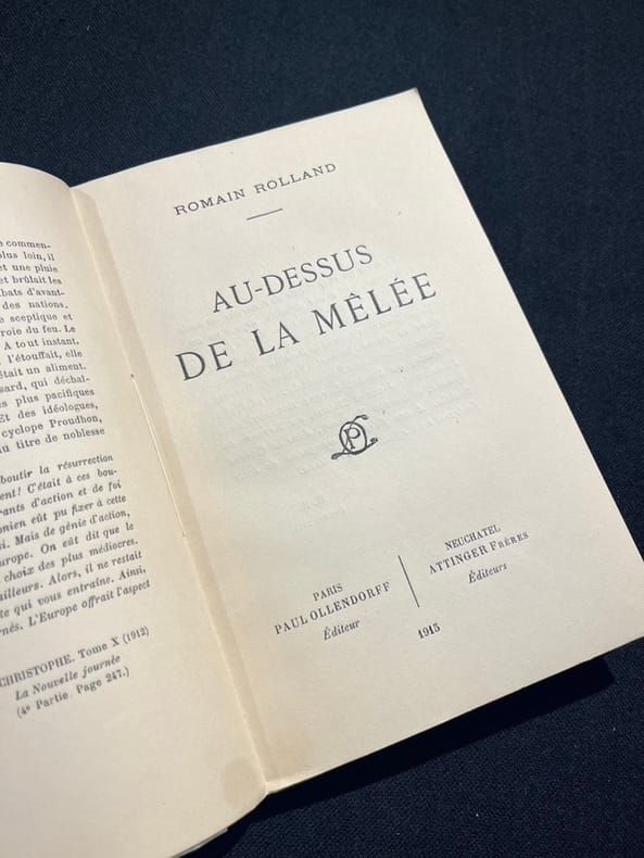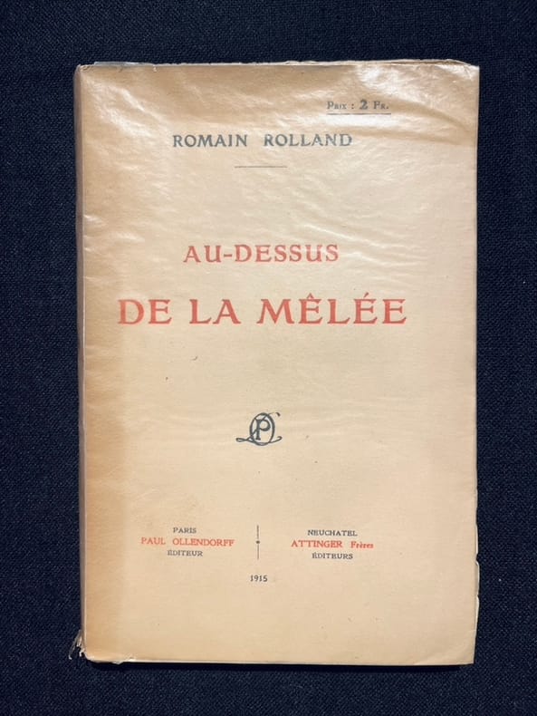Édition originale de ce recueil d'articles parus dans le Journal de Genève entre septembre 1914 et août 1915 qui firent de Rolland le défenseur du pacifisme et qui devint la cible des nationalistes. Il obtint cette même année le prix Nobel de littérature.Couverture partiellement brunie, intérieur très frais.