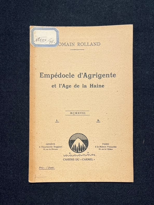 Première édition publiée en France, dans la collection des Cahiers du Carmel, avec la mention première série, n°1. "En décembre 1917, Baudouin et ses amis opèrent un dédoublement d'un autre type: suite aux nouveaux décrets français qui rendent très difficile l’entrée de revues étrangères en France, un Carmel français est créé à Paris à la Maison d’édition française (qui a pour dogme – comme le signale une devise ? «la libre expression des esprits et des talents»). " in Revues Culturelles Suisses, en ligne (Viviane Brog & Baptiste Gremaud). A noter qu'une édition qui semble antérieur de peu a été éditée à Genève, sur les presses de l'imprimerie Reggiani.