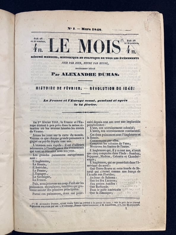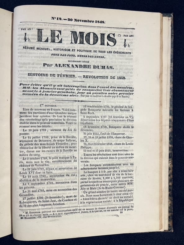 Le Mois. Résumé mensuel, historique et politique de tous les événements, jour par jour, heure par heure, entièrement rédigé par Alexandre Dumas. Du numéro 1, Mars 1848 au numéro 12, 30 Novembre 1848. (Paris: Typographie de E. et V. Penaud frères, 1848). [M.C.: histoire 19e siècle]