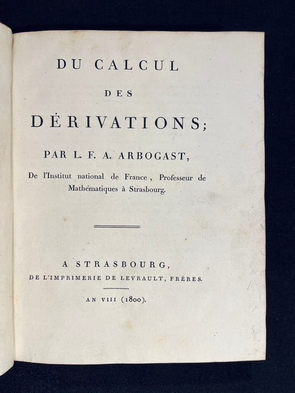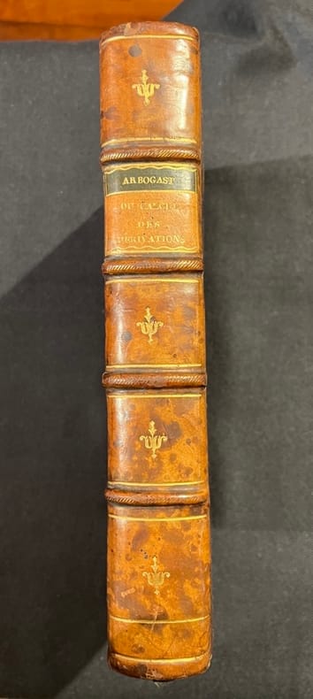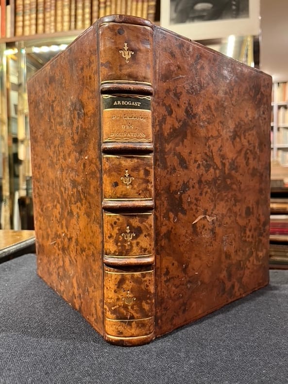 Édition originale. "Se situant dans le courant de Lagrange pour traiter l'analyse mathématique dégagée «de toute considération d'infiniment petits, d'évanouissants, de limites...», Arbogast fut oublié en France, lorsque Cauchy fonda l'analyse sur d'autres critères. Pourtant il avait développé de façon originale certaines idées sur les fonctions et les différentielles, et surtout il avait mis au point une formule de calcul, mal comprise en France, mais fort utilisée et commentée en Angleterre : "The rule of the last and last but one" (De Morgan, Cayley, etc.). " voir Jean-Pierre Friedelmeyer, in "Le calcul des dérivations d'Arbogast dans le projet d'algébrisation de l'analyse, à la fin du dix-huitième siècle". Mouillure à une dizaine de feuillets, sinon bon exemplaire.