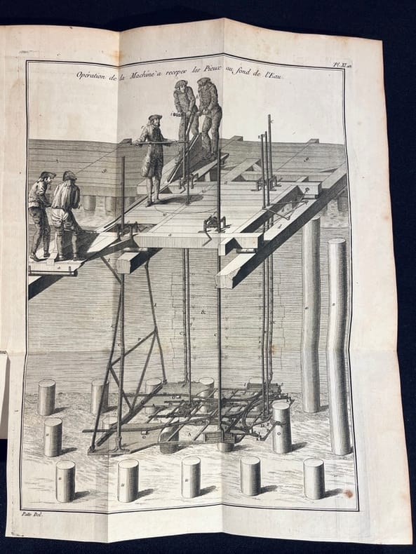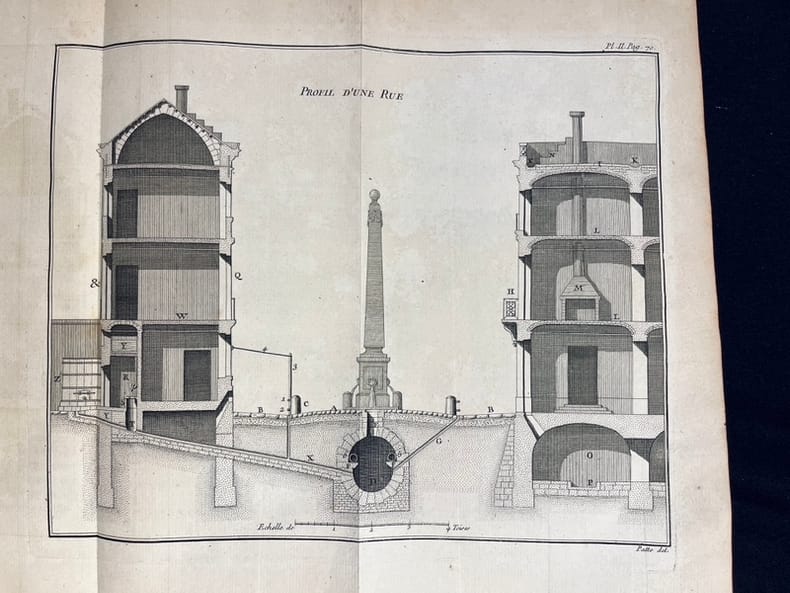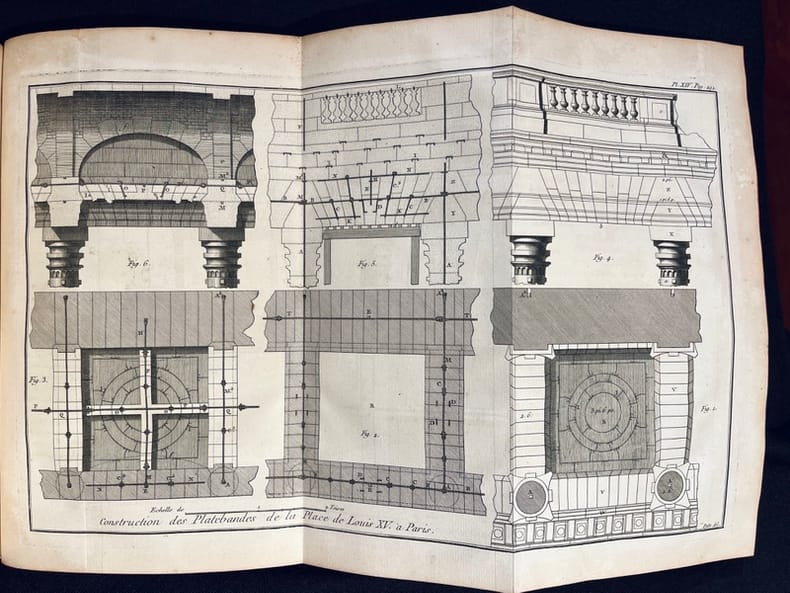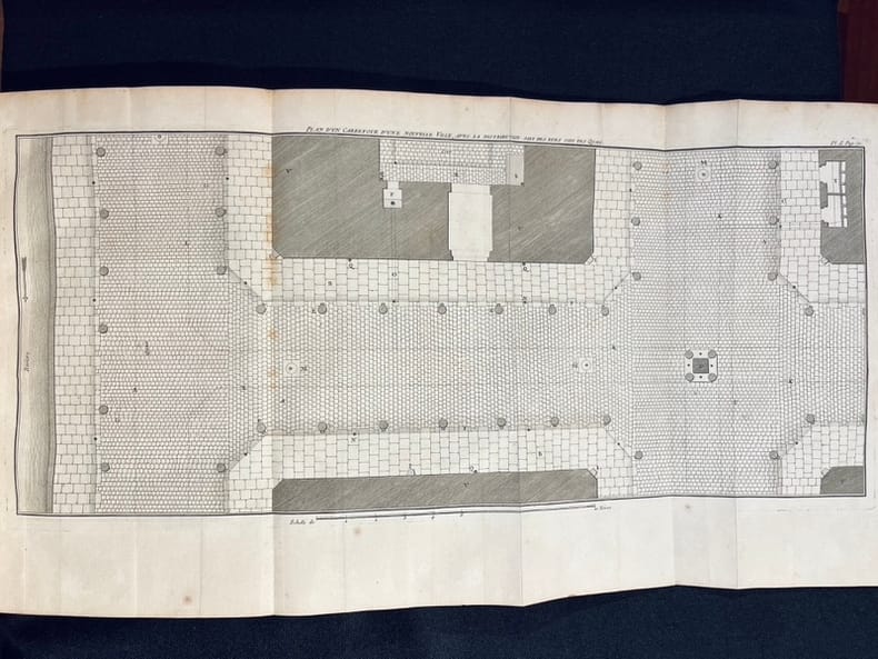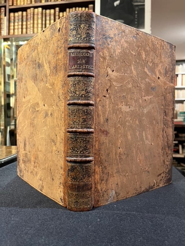 Paris, chez Rozet, 1769. 4to. viii + 376 pp. + 27 engraved plates (25 folding). Engraved vignette on title. Contemporary mottled calf, raised gilt back, red leather title label. Fine copy, with only a tear at the head cap. Contemporary manuscript ex-libris 'appt (appartenant) a Prott 1770' . First edition of this important and comprehensive work on construction and townplanning, including the laying-out of streets, construction of foundations, drains, the use of fountains, etc. Fowler 242. Berlin Cat. 2426..