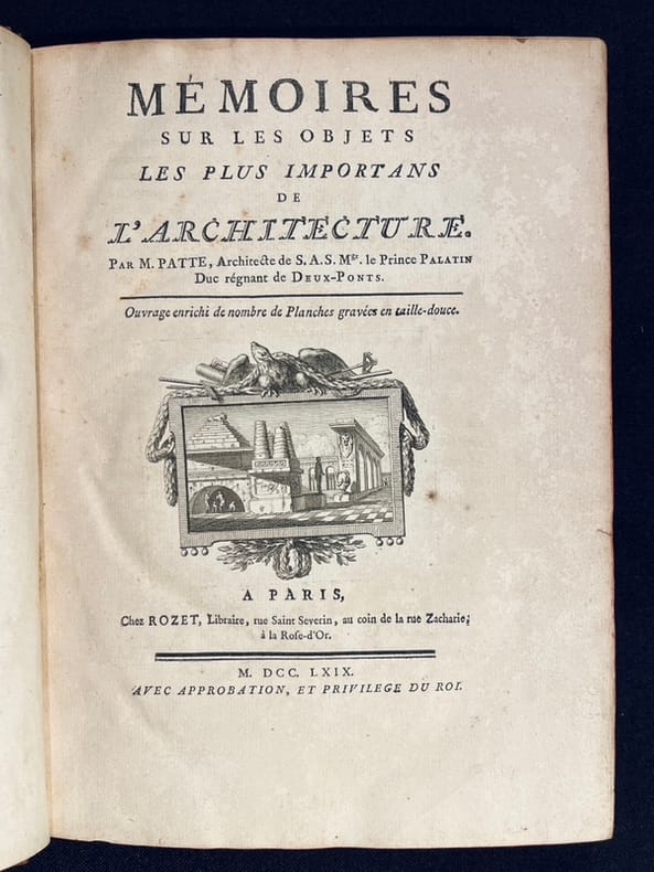 Illustré d'une vignette de titre, d'un bandeau gravé et de 27 planches gravées dépliantes, hors-texte. Édition originale. Élève de Germain Boffrand, Patte fut l'assistant de Jacques François Blondel ( il termine son Cours d'architecture après la mort de celui-ci en 1774 et se charge de le faire éditer).Il invita à penser la ville comme un ensemble, et fut l'un des premiers à présenter sur un plan de ville des sections montrant les immeubles et le système d'égouts en coupe. Patte avait conçu de grands projets pour Paris, consistant à ouvrir de grandes voies rectilignes et à déplacer cimetières et hôpitaux qui préfigurent les travaux du baron Haussmann. Son ouvrage s'achève sur un Mémoire concernant le portail de l'église Saint Sulpice dans lequel il critique Servandoni.Déchirure avec manque de papier p. 63 mais sans perte de texte. Papier bruni. Reliure épidermée et frottée.