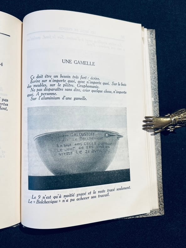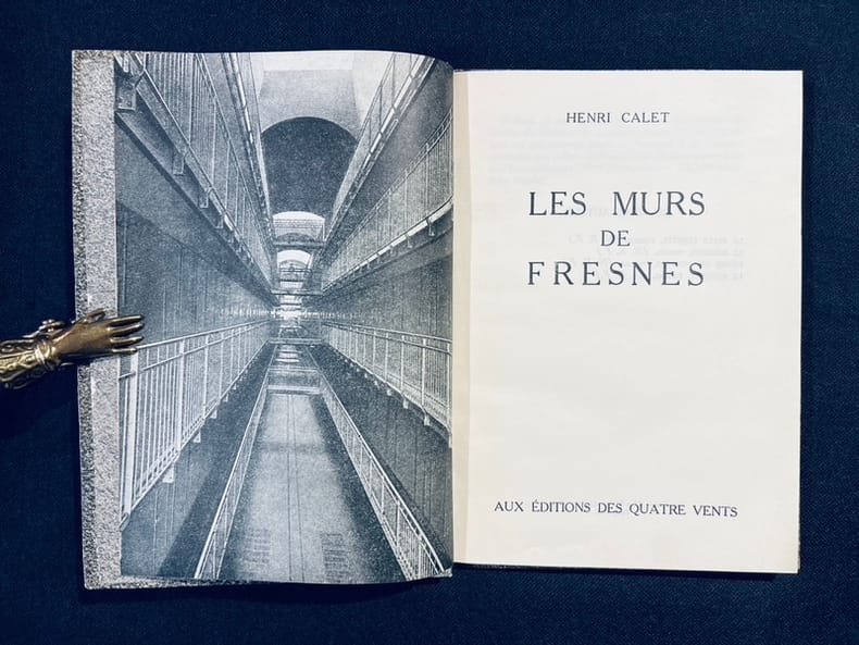 ed. des Quatre vents 1945 in-8 cartonnage ed., H.C. collecte les graffitis sur les murs de la prison Fresnes avec certains photographies par J. GERARD, BERNES, MAROUTON. Un livre bouleversant_! Patrick Modiano, dans le Cahier de l’Herne à lui consacre parle de l’importance de ce livre et il y a un lien de parente evident chez ces deux auteurs dans cette volonte de recueillir les traces de destins anonymes, 1er mille