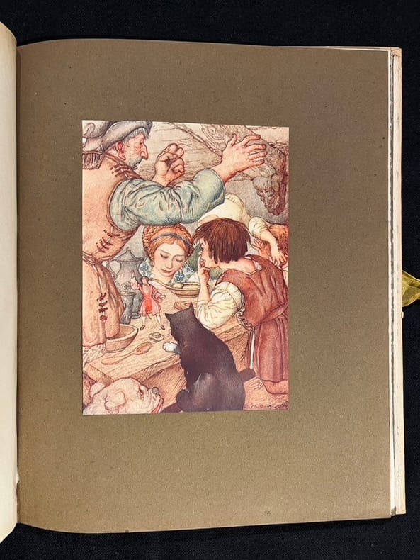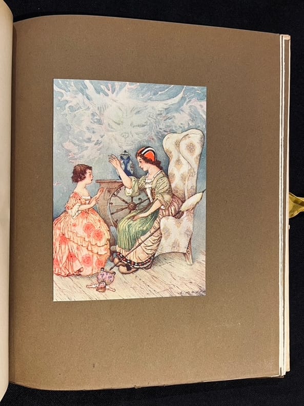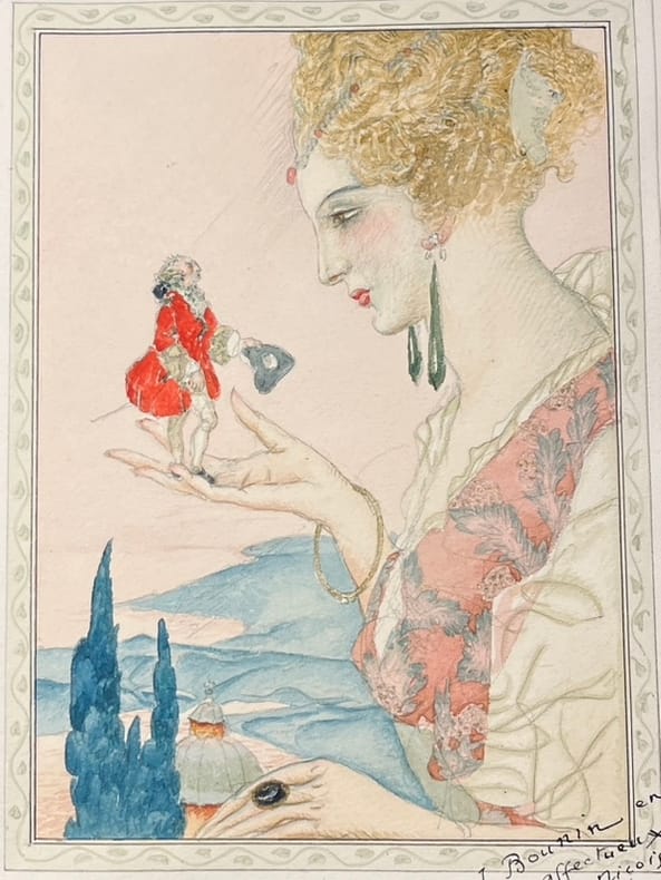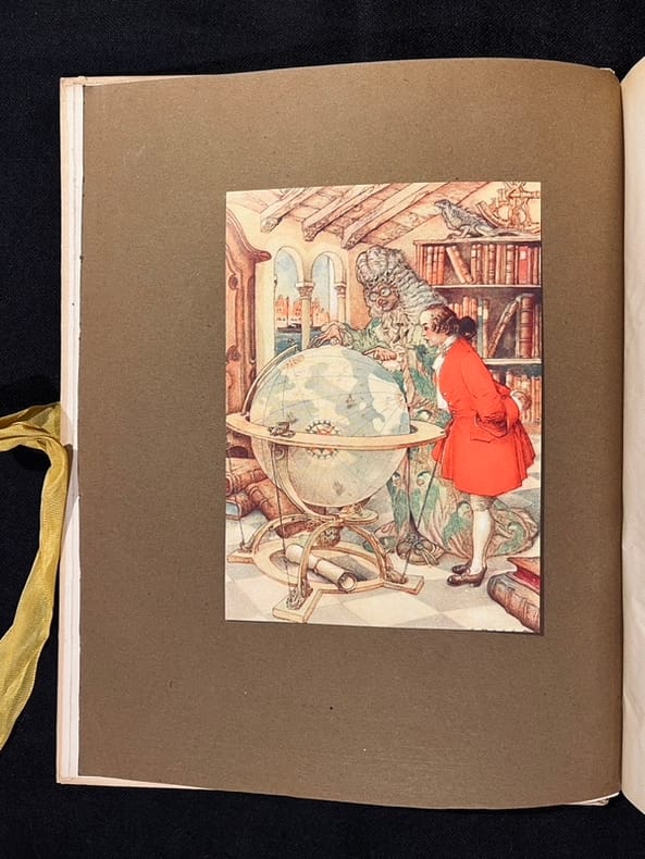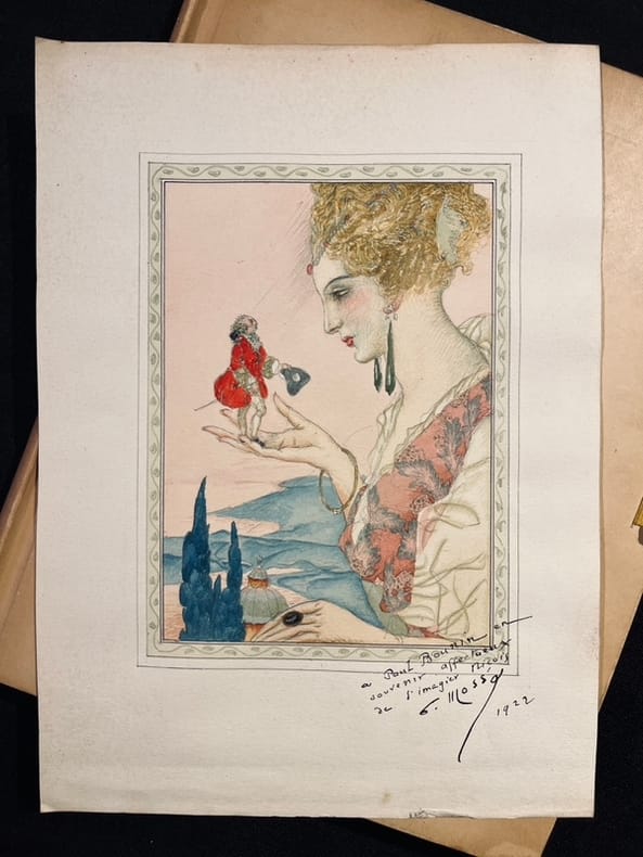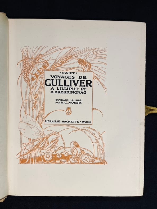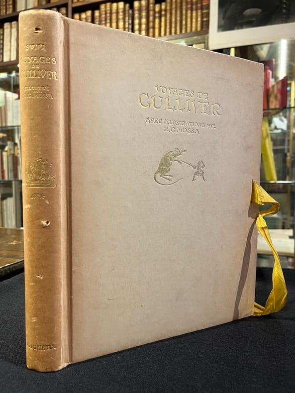 Illustré par Gustave-Adolphe Mossa de 13 planches hors-texte en couleurs contrecollées sur papier brun écru et de nombreuses compositions au trait. Belle édition illustrée à laquelle on joint une aquarelle originale de Mossa signée : " à Paul Bounin en souvenir affectueux de l'imagier niçois. G. Mossa 1922." L'aquarelle est rehaussée de petites touches d'or pour les bijoux de la femme qui tient Gulliver dans le creux de sa main. Cartonnage bruni, deux chocs au dos, éraflure au second plat.