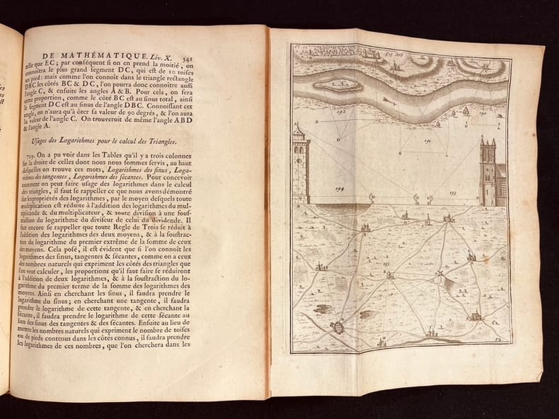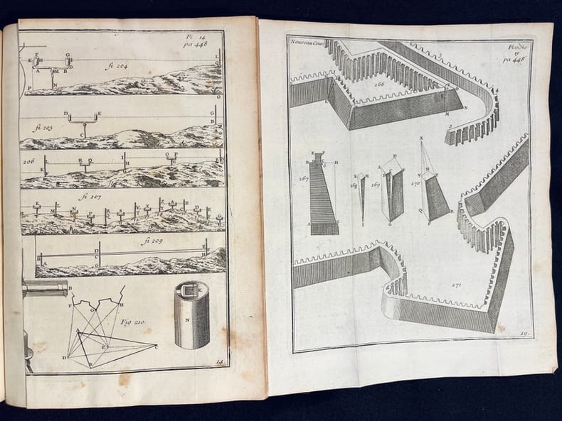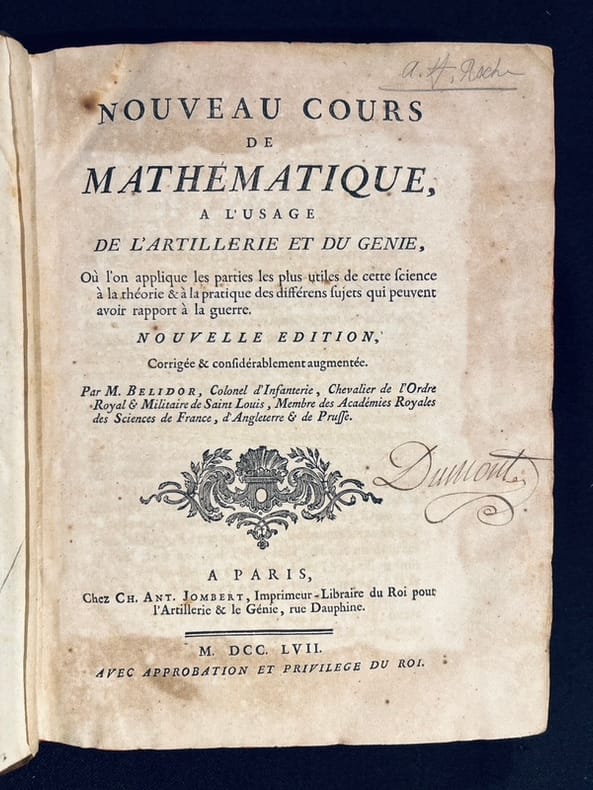 Illustré de 34 planches dépliantes hors-texte. "Le Cours de mathématique, paru en 1725, ne se limite pas aux mathématiques, c’est un manuel d’ingénieur, en ce sens qu’il donne aux utilisateurs les moyens nécessaires à une exécution raisonnée et savante de leur métier. Ce n’est pas un manuel de règles standard, chaque proposition ou chaque théorème sont démontrés. Partout où cela est possible les démonstrations sont mathématiques, Bélidor cherche à asseoir une pratique savante des techniques des ingénieurs et des artilleurs sur des principes scientifiques." Bernard Delaunay, Les livres d’ingénieurs au xviiie siècle : le cas emblématique de Bélidor, 2020. Papier bruni, rousseurs.