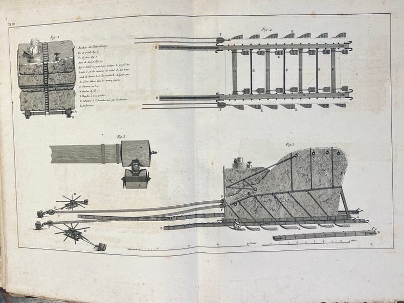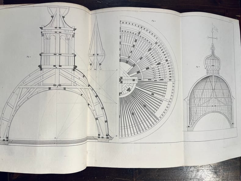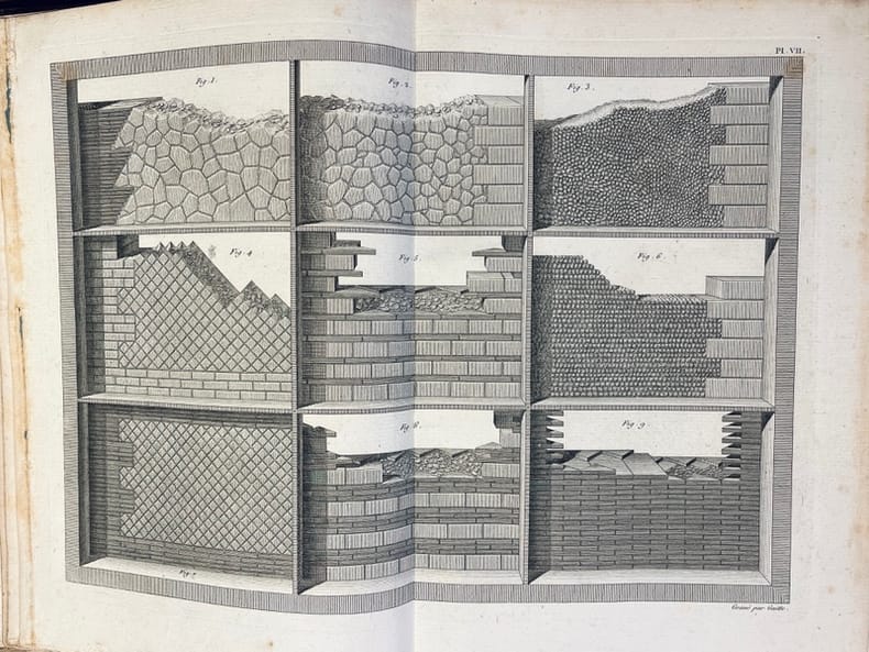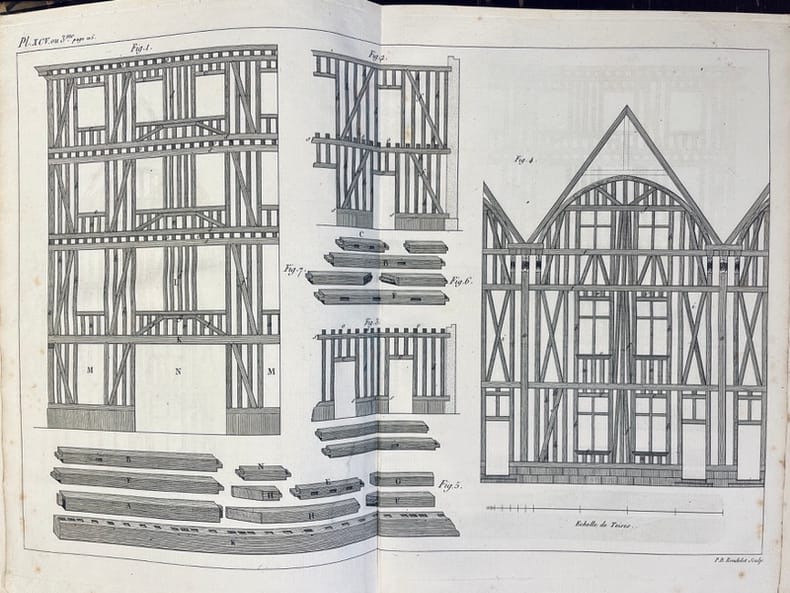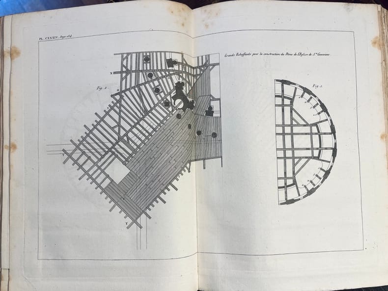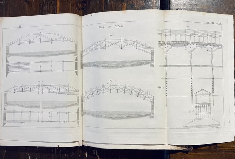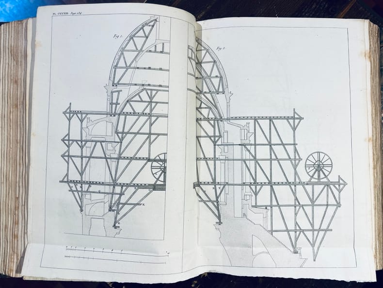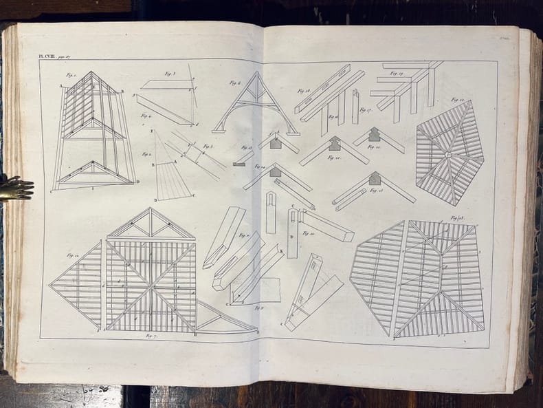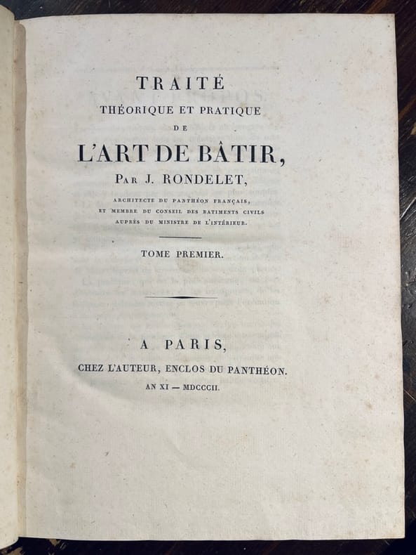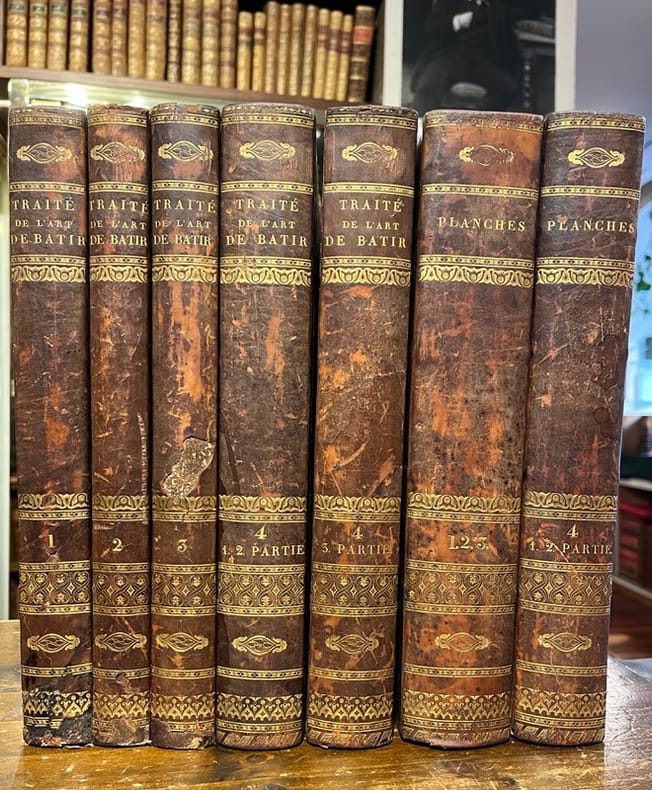 Illustré de 190 planches doubles gravées (parfois dépliantes). 93 planches pour le premier volume et 89 pour le second. Et 8 dans le dernier volume de texte. Édition originale de ce monumental ouvrage, publié à petit nombre par son auteur. Il concerne tout les domaines de la construction, de la maçonnerie à la charpente, de la menuiserie à la serrurerie en passant par la couverture. Maison, coupoles, routes, ponts, etc. Le "Traité vise à établir une science de la construction garantissant la force, la durabilité et l'économie de l'architecture ; il traite les composants de l'édifice et l'édifice dans son ensemble d'un point de vue purement structurel, sans aborder la question de la composition architecturale et de l'ornementation. La répartition des éléments de construction et de modules structurels rend le traité de Rondelet complémentaire de l'enseignement de Jean-Nicolas-Louis Durand dans son Précis des leçons d'architecture données à l'École polytechnique. Le succès du Traité vient de la clarté de la méthode et de la proposition d'outils de conception d'application facile." wikiLe tome premier contient les deux premiers livres (publié en 1802); le tome deuxième (1804) contient les livres trois et quatre; le troisième tome (1805) a le livre cinq; puis le quatrième tome (1810) les livres six et sept, enfin le dernier volume (1817) et la troisième partie du quatrième tome et on y trouve le livre huit. Les 182 planches sont reliées dans 2 volumes à part (sauf les 8 planches publiées en 1817 qui sont reliées à la fin du dernier volume de texte). Les faux-titres et les titres ont été reliés dans chacun des volumes. Reliures épidermées, coiffes et coins tapés, rousseurs (parfois prononcées).