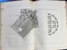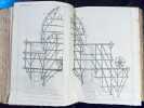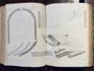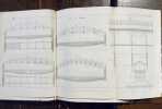 Les 2 volumes d’atlas de la treizième édition de ce classique qui comprend en outre 5 volumes et 2 suppléments. Nombreuses planches de techniques constructives (maçonnerie, charpente, construction en pierres de taille, menuiserie, serrurerie, etc.), de théories de construction, de projets de gares ferroviaires. Jean Rondelet (1743-1829) élève de Soufflot, participa à l’édification du Panthéon. Bon état d’occasion