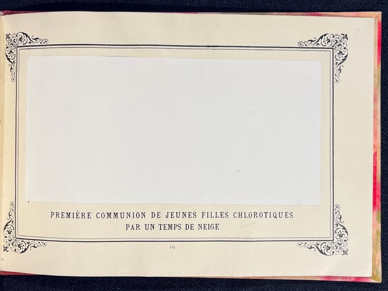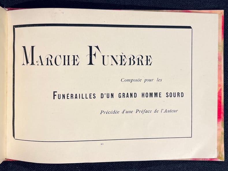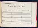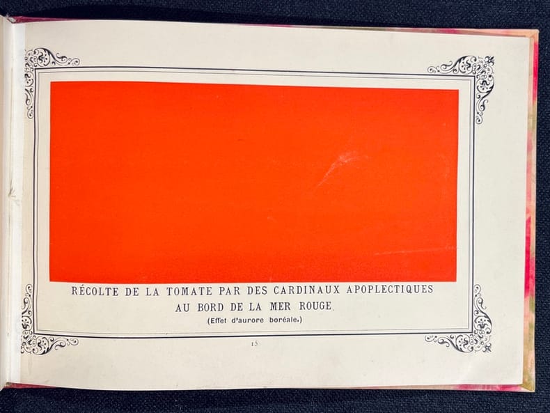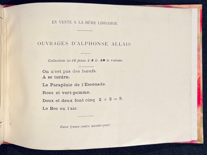 Édition originale du premier catalogue de peintures monochromes jamais imprimé! L'ouvrage est d'une insigne rareté. Il est composé d'une intéressante et spirituelle préface où Alphonse Allais précise comment lui est venu le désir de devenir peintre: "Et quand je disais peintre, je m'entendais: je ne voulais pas parler des peintres à la façon dont on les entend le plus généralement, de ridicules artisans qui ont besoin de mille couleurs différentes pour exprimer leurs pénible conceptions. Non! Le peintre que je m'idéalisais, c'était celui génial à qui suffit pour une toile une couleur : l'artiste , oserai-je dire monochroïdal." L'illustration se compose de 7 monochromes imprimés, sauf le dernier qui est collé. Chacune des oeuvres est imprimée dans un cadre typographique et acco mpagnée de son titre pénétrant.La seconde partie de l'ouvrage est consacrée à la marche funèbre pour les funérailles d'un grand homme sourd. La préface en donne toute la mesure: " L'auteur de cette Marche funèbre s'est inspiré, dans sa composition, de ce principe, accepté par tout le monde, que les grandes douleurs sont muettes. Les grandes douleurs étant muettes, les exécutants devront uniquement s'occuper à compter des mesures, au lieu de se livrer à ce tapage indécent qui retire tout caractère auguste aux meilleures obsèques. " Deux pages de partition vierges suivent, avec l'indication "Lento rigolendo". La couverture imprimée, qui sert de page de titre, est tachée (avec une légère décharge sur le feuillet suivant).Un livre célèbre dont sa rareté constitue une partie de sa légende, l'autre partie étant sa modernité. 4 minutes 33 de bonheur ;-)).